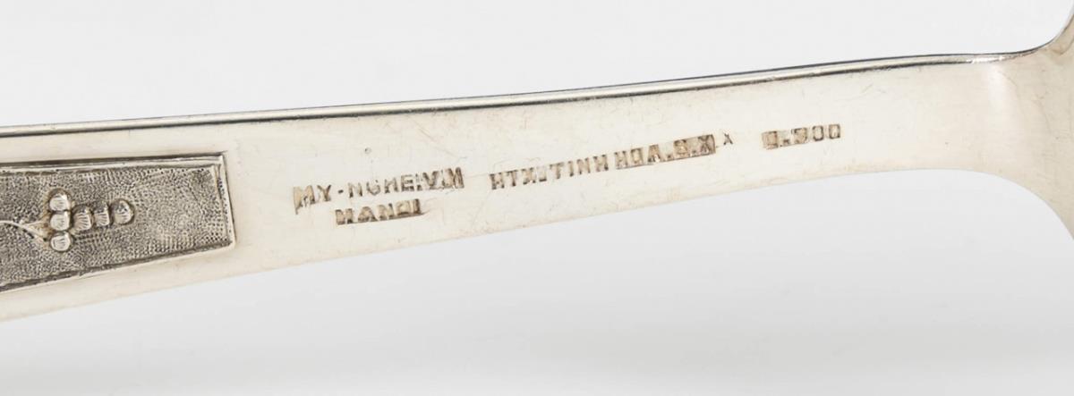 Figürliches Teesieb, Tortenheber, 8 lange Bowlelöffel, 6 kleine Löffel und 12 Kaffeelöffel.