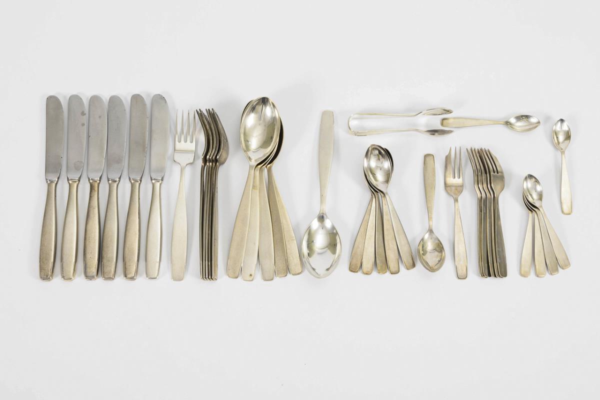 37 Teile. Schlichte, zeitlose Form. 6 Messer, 6 Gabeln, 6 Löffel, 6 Kaffeelöffel, 6 Kuchengabeln, 6 Mokkalöffel und Zuckerzange. In WMF-Kasten ohne Deckel. Minimale Gebrauchsspuren.