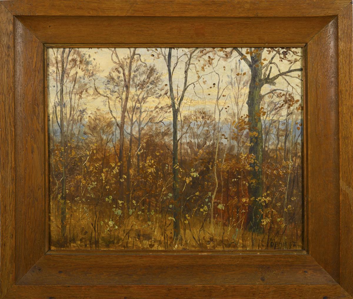 In Anlehnung an Karl Buchholz gemalter Blick durch die schlanken Bäume unter herbstlichem Himmel. Minimale Altersspuren.