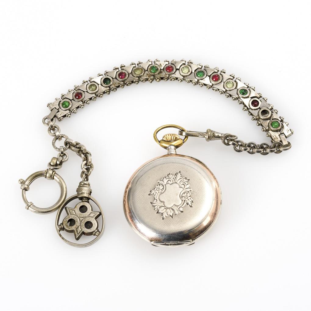 Guillochiertes Galonné-Gehäuse mit leerer Wappenreserve, im Rückdeckel graviert "Franz Philipp, Ostrowo". Dazu eine Metallkette mit teils farbigen Ziergliedern, Karabiner und Federring, L 28,5 cm. Leicht berieben und partiell gedellt.