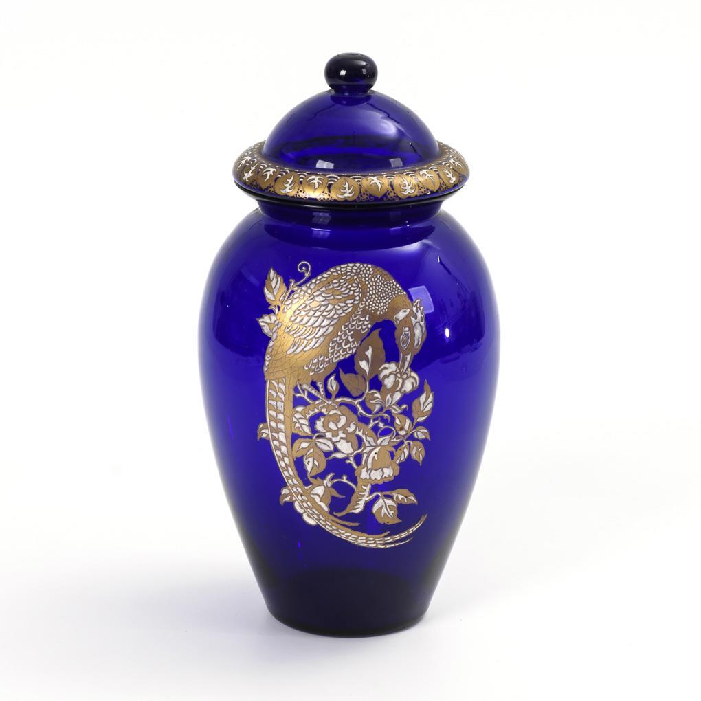 Kobaltblaues Glas, Goldmalerei, weiße Emailmalerei. H 32,5 cm.