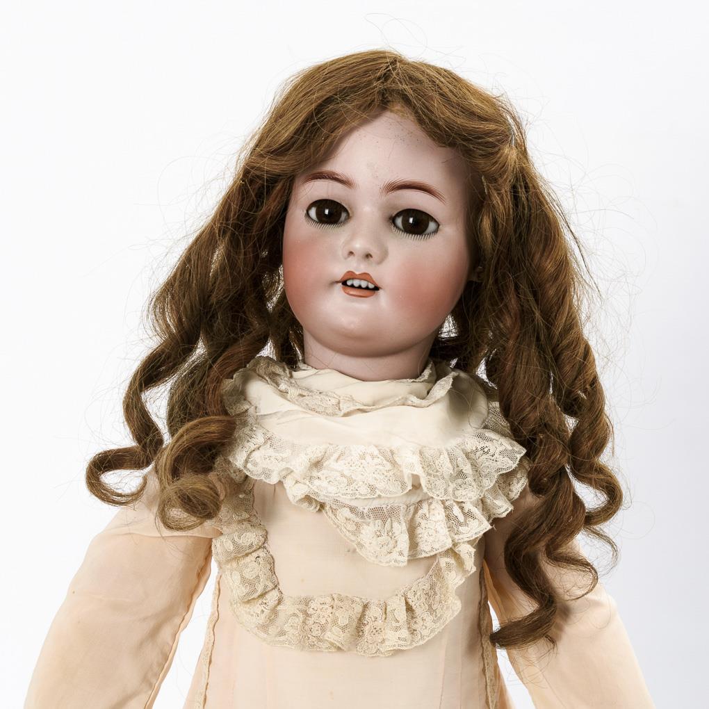 Kurbelkopf, braune Schlafaugen, Wimpern, Ohrringe, rotbraune Echthaarperücke. 11-teiliger Gliederkörper mit 2-geteiltem Torso und verstummter Zugstimme (ohne Zugbänder). Hellrosa Kleid, jünger ergänzte weiße Satinschuhe. Kopf durchleuchtet: ohne Defekte, Körper wohl partiell etwas übermalt.