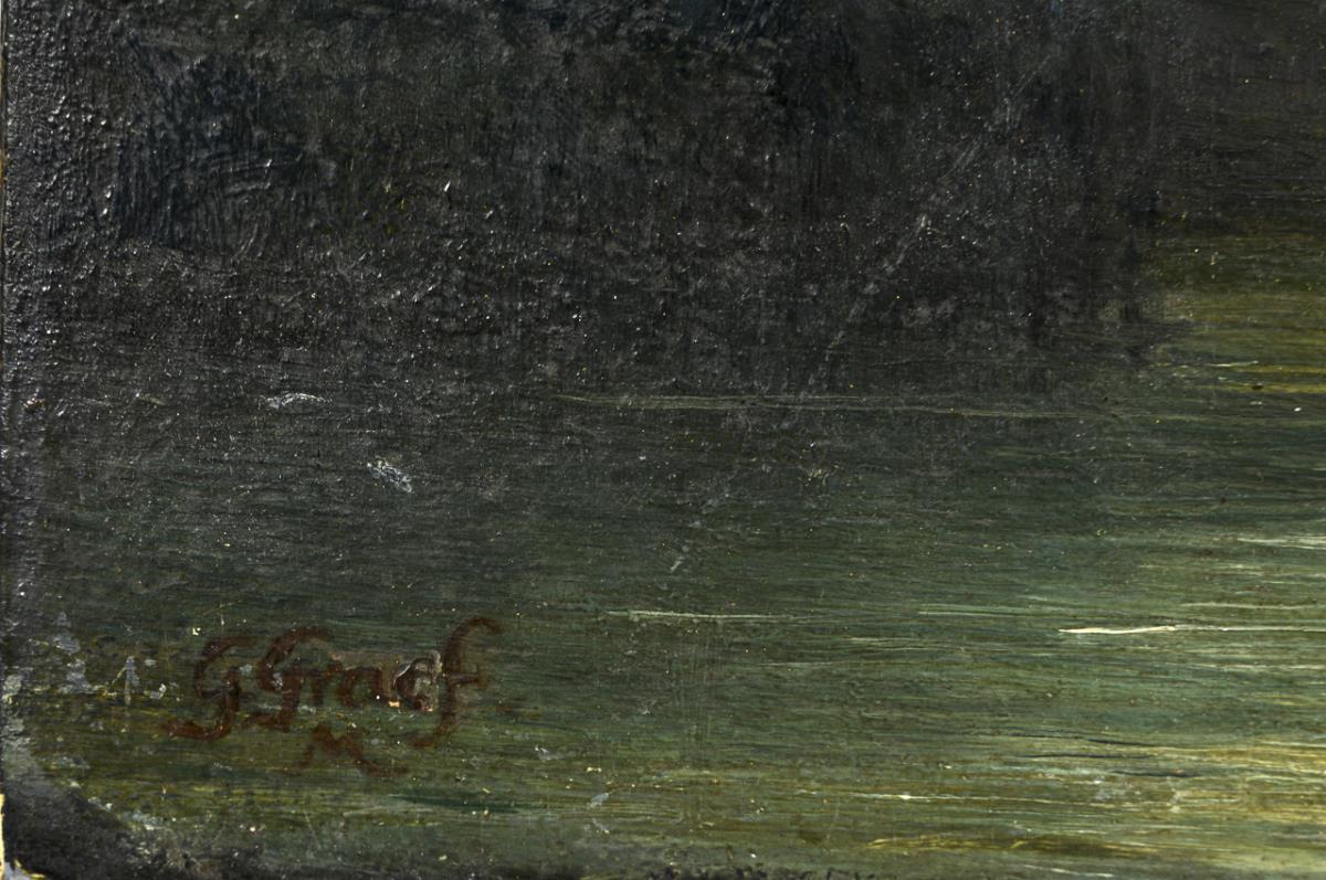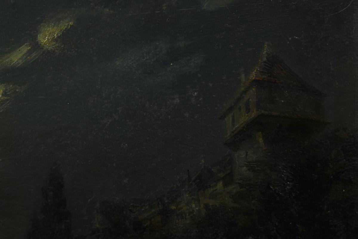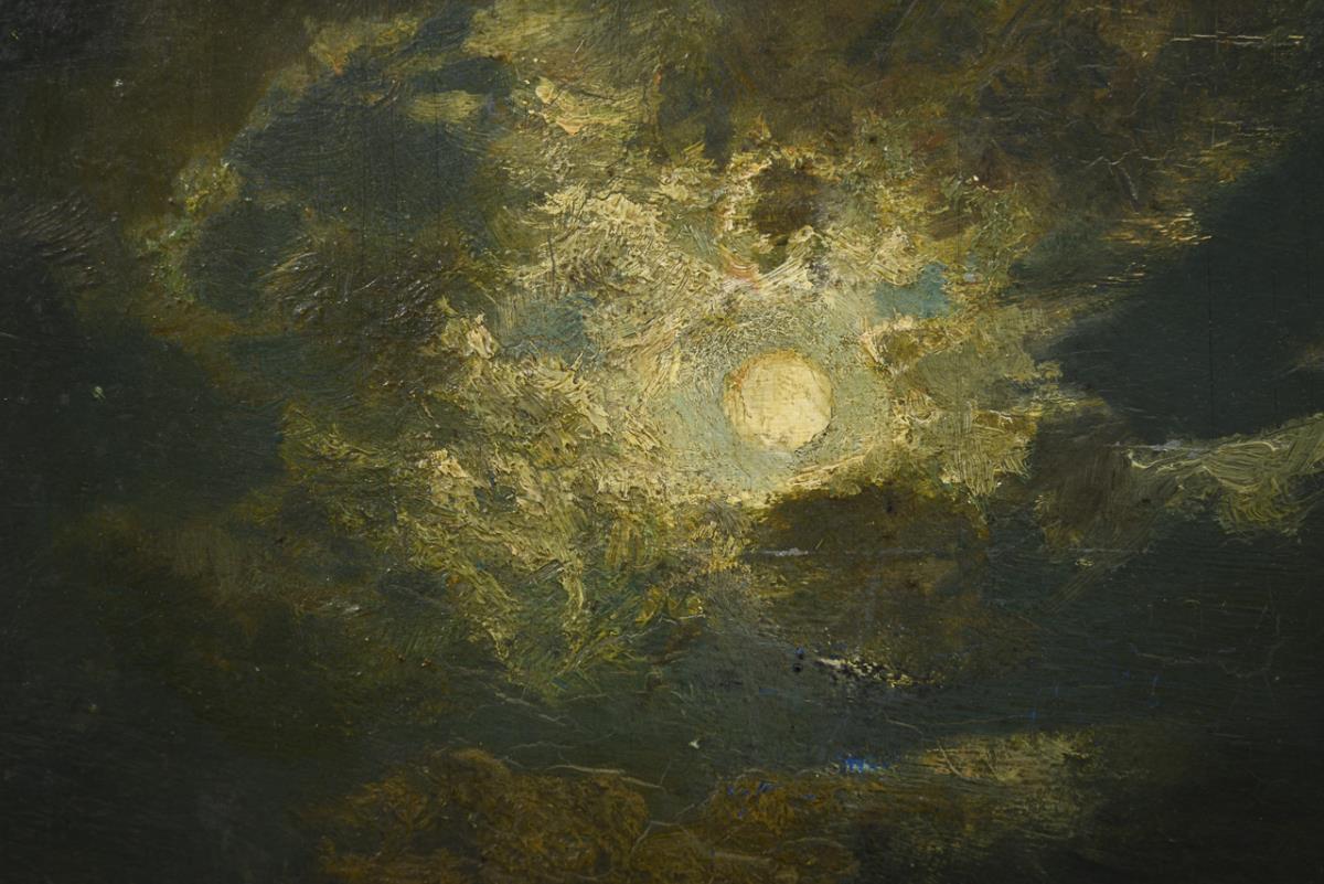 Segler am Steg unterhalb des Hauses im hellen Licht des Vollmondes. Altersspuren.