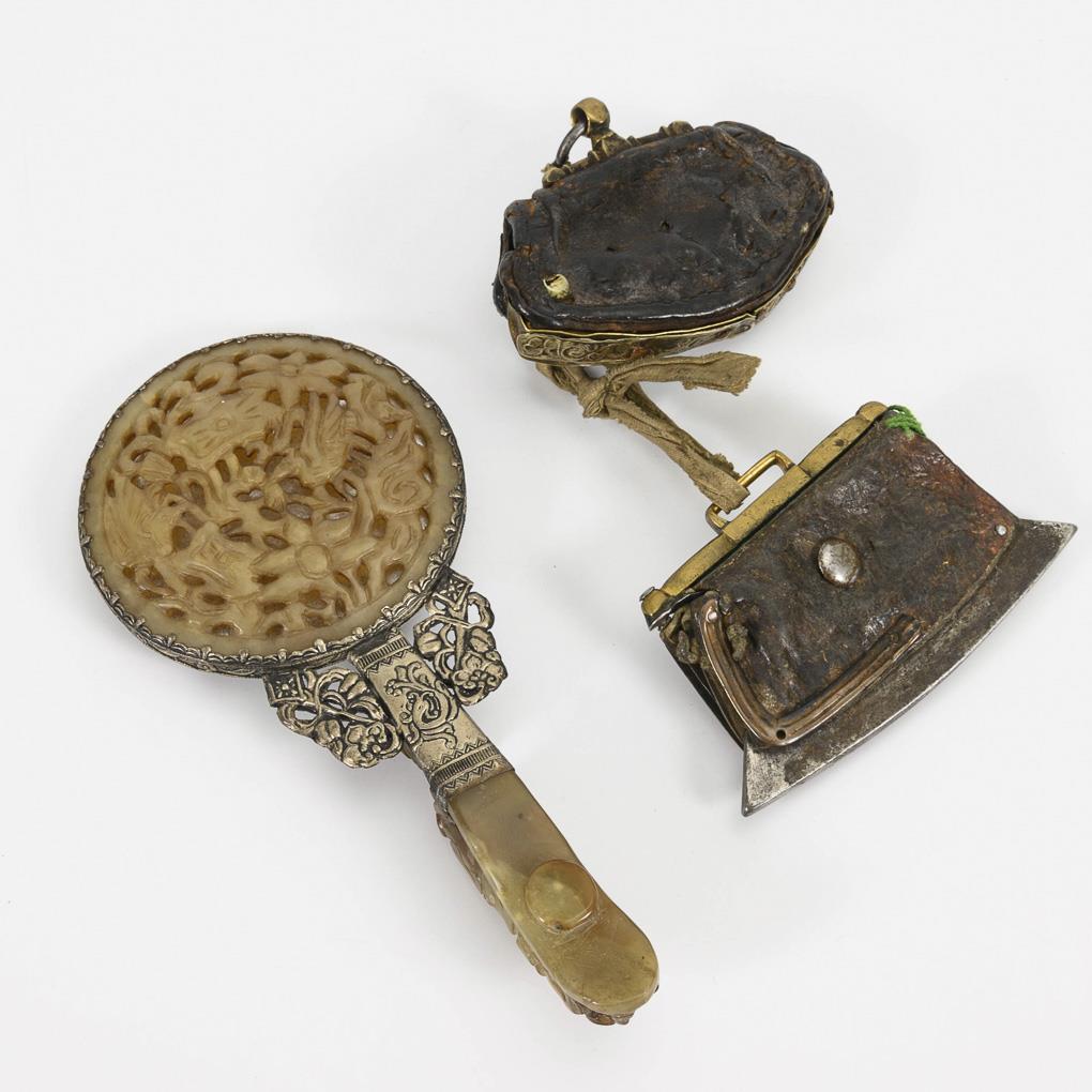 Spiegel, Feuerstahl und Täschchen. Alle mit reliefierten Metallfassungen, teils besetzt mit Koralle und Türkis. Spiegel mit einem geschnitzten Griff; Rückseite aus durchbrochen gearbeitetem Speckstein. L 22 cm. Alters- und Gebrauchsspuren.