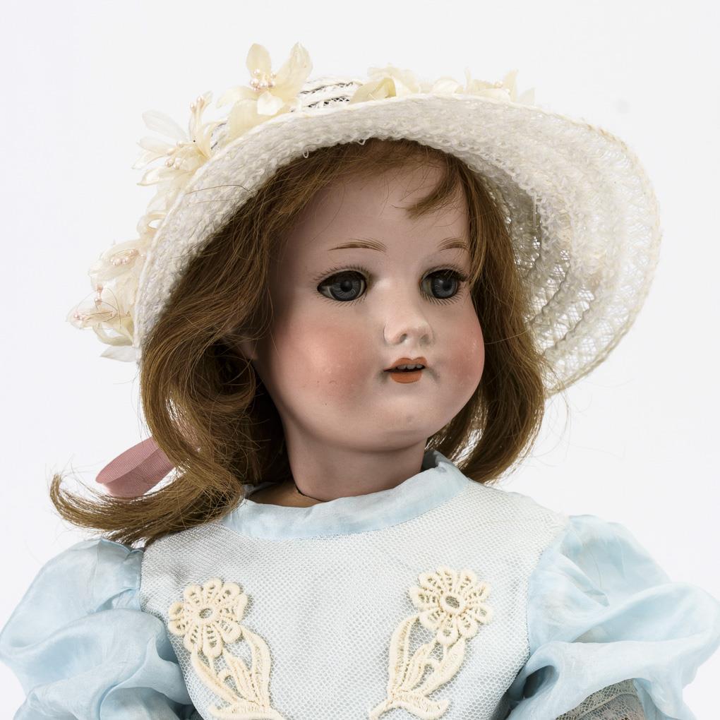 Drehbarer Kurbelkopf, blaue Schlafaugen, Wimpern, blonde Echthaarperücke. 11-teiliger Laufpuppenkörper mit intaktem Mechanismus und Stimme. Hellblaues Seidenkleid, weiße Schuhe, weißer Strohhut. Kopf durchleuchtet: ohne Defekte.