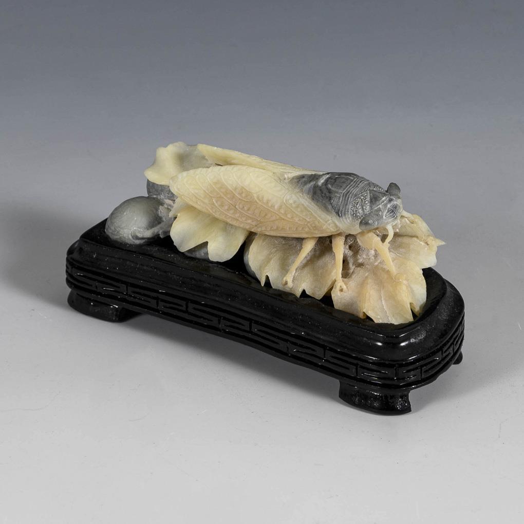 Naturalistisch geschnittene Grille auf einem Beerenzweig, aus zweifarbigem Stein, auf Holzsockel.
