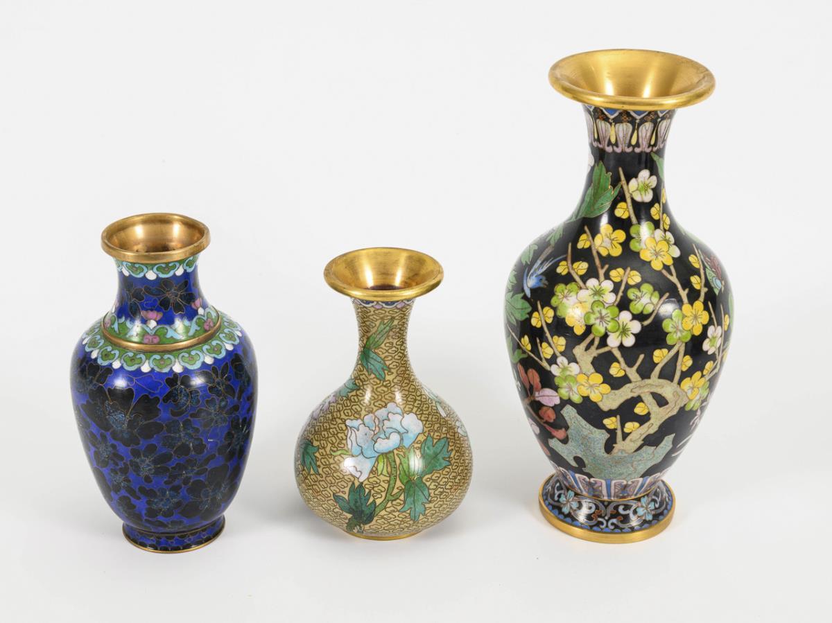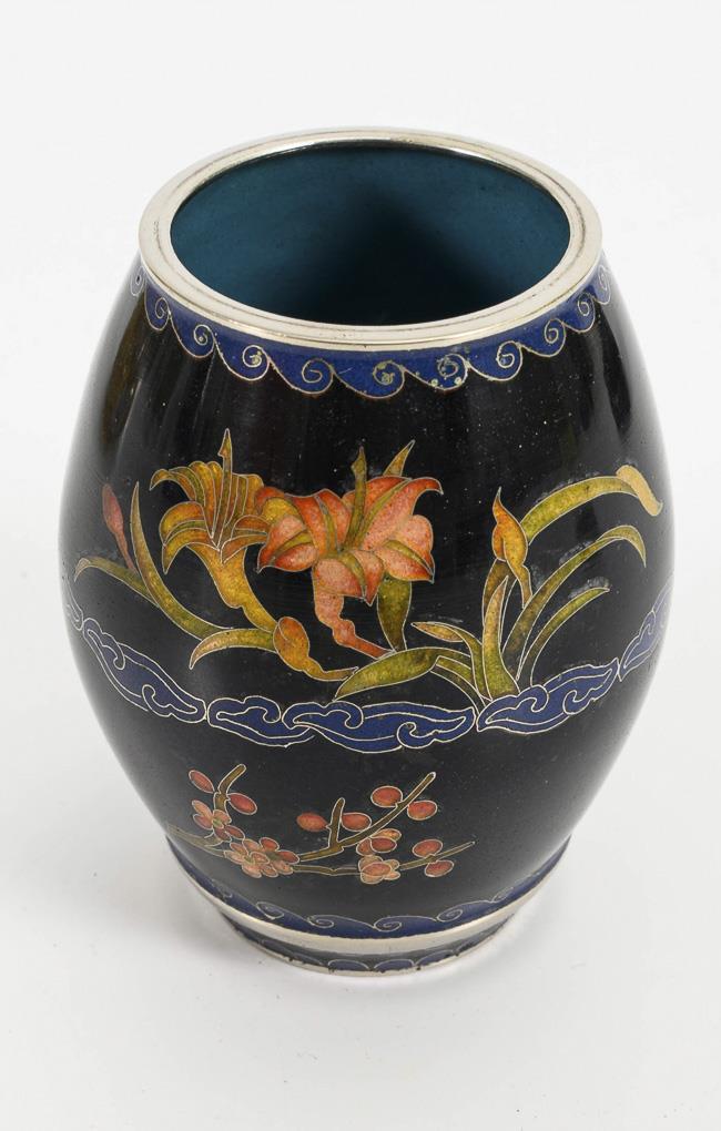 Dose in 'offener Cloisonnétechnik' mit passendem Holzsockel. Drei Balustervasen mit verschiedenen Blütendekoren. Tönnchendose mit flachem Deckel und transluzidem Email auf schwarzem Grund.