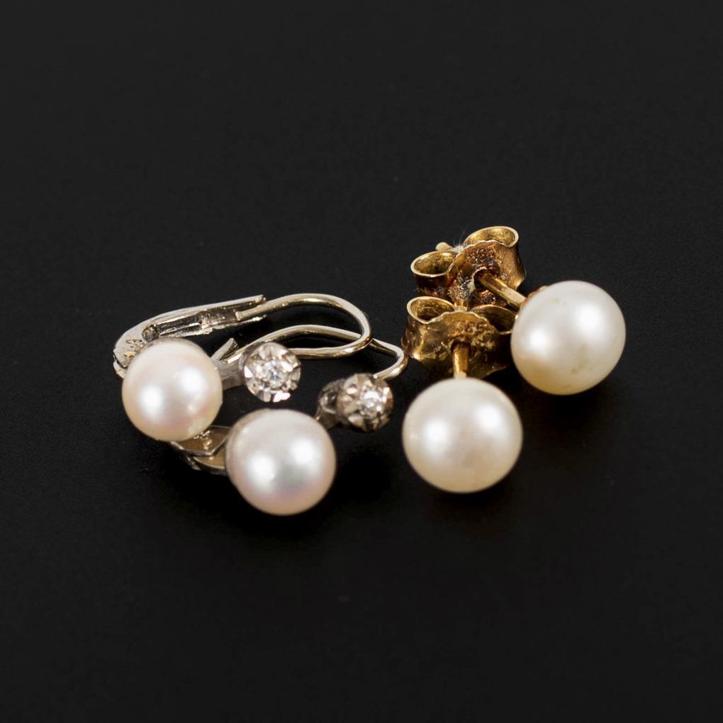 Ohrhängerpaar mit Zuchtperlen und Kleinstdiamanten, an Federbügel. Ohrsteckerpaar mit Zuchtperlen. Steckmechanik.