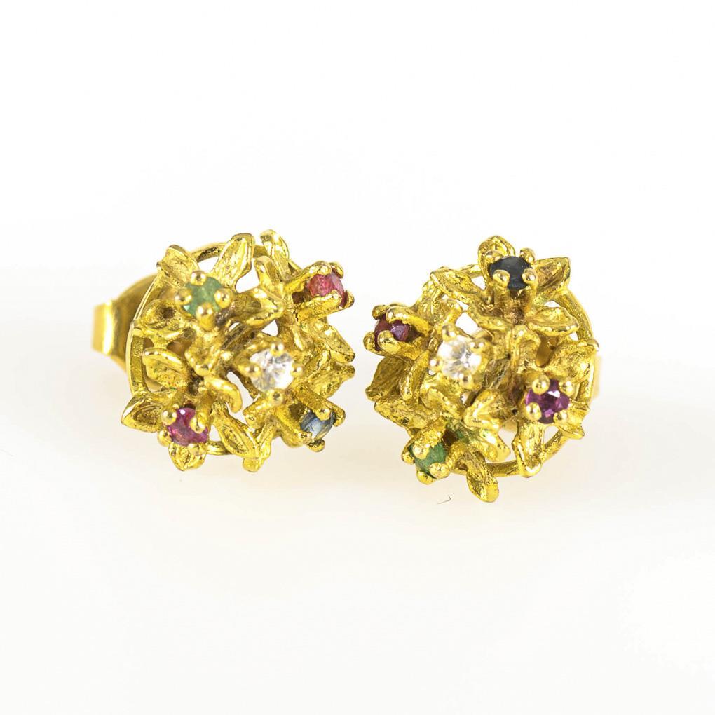 Blütenbrisur mit chatongefasstem, kleinen Saphir, Rubinen, Smaragd und Bergkristall. Steckmechanik.