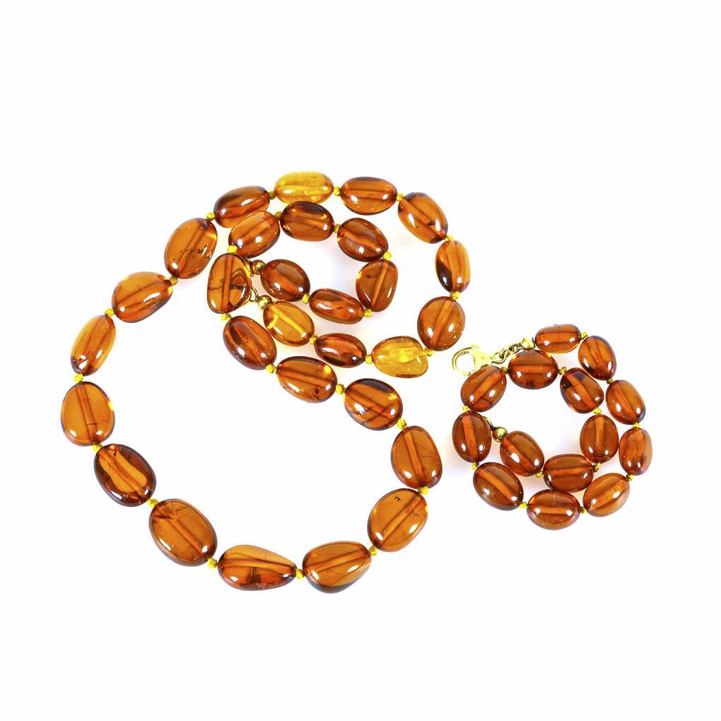 Schnürketten mit Bernsteinoliven in Einzelverknotung im leichten Verlauf, an Karabinerschließen.