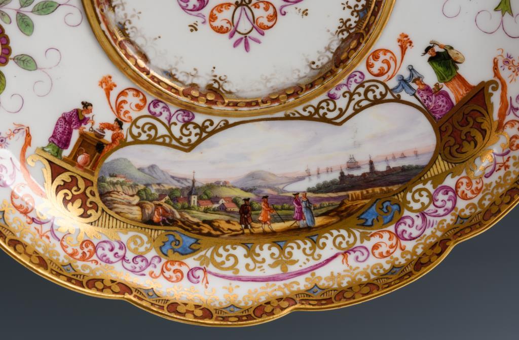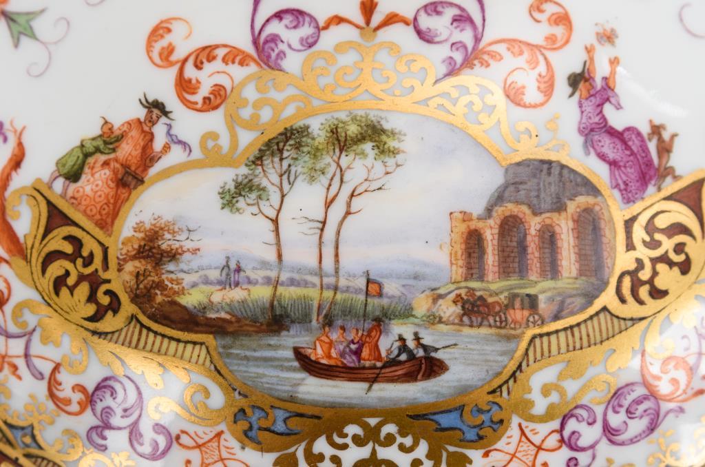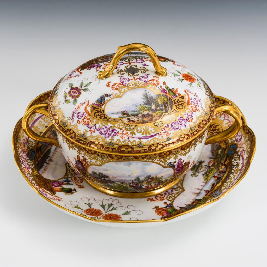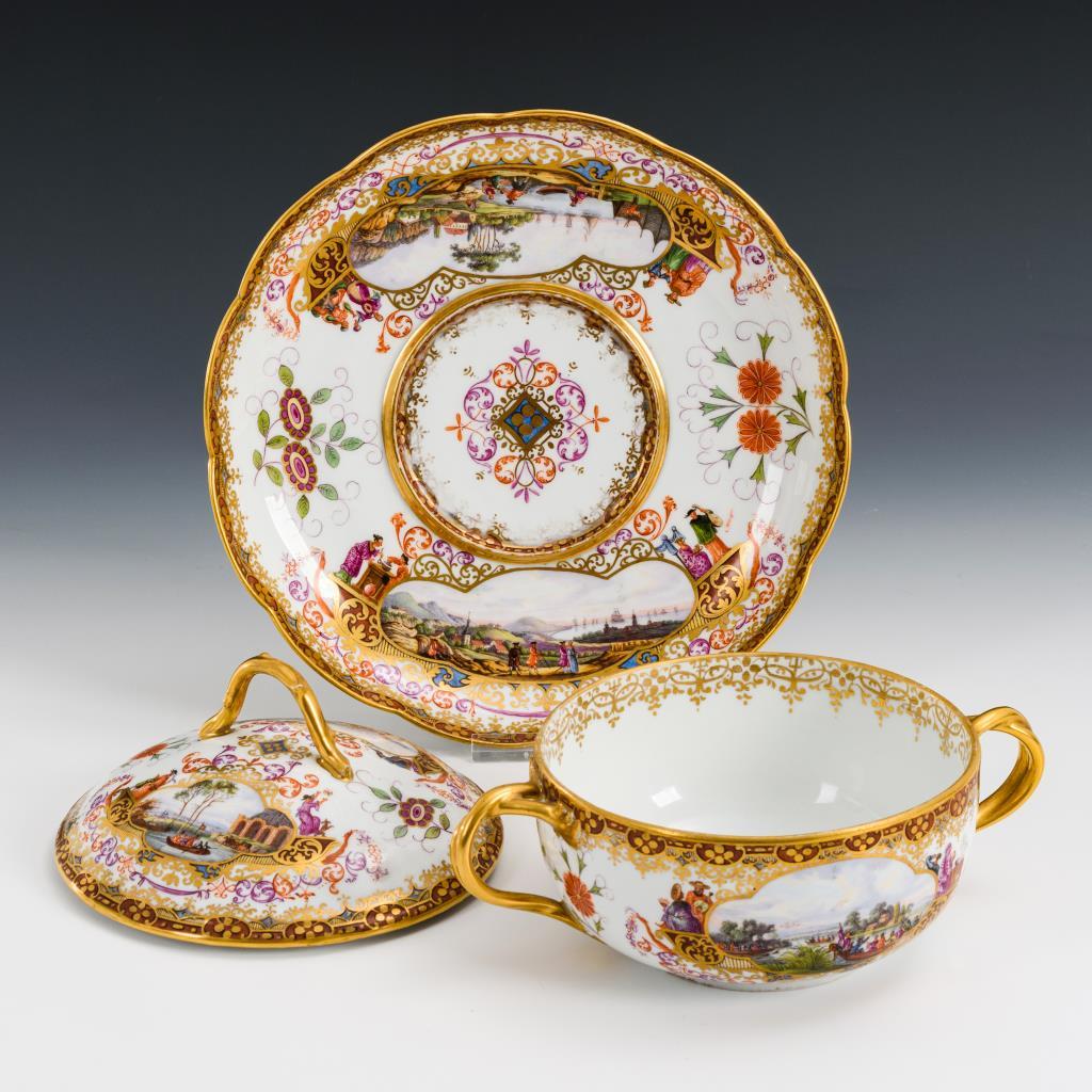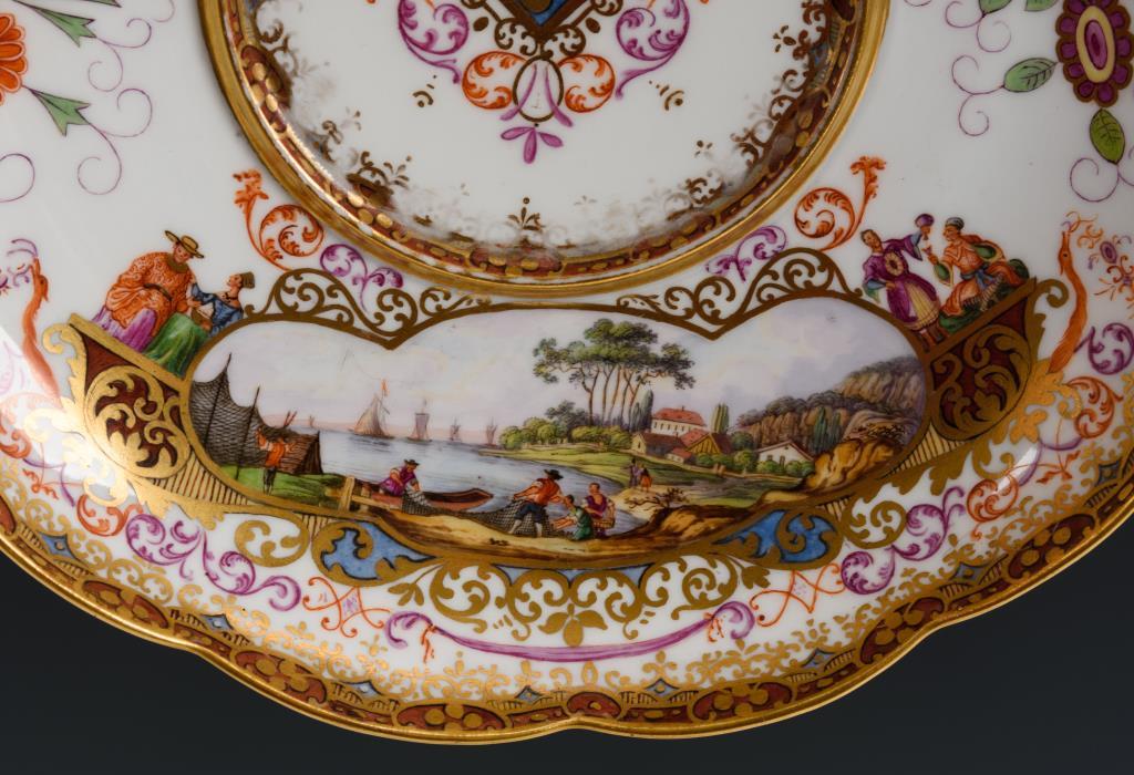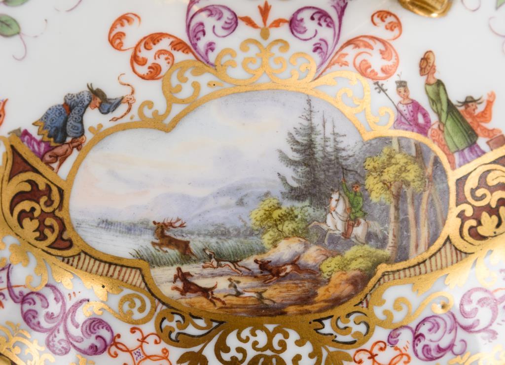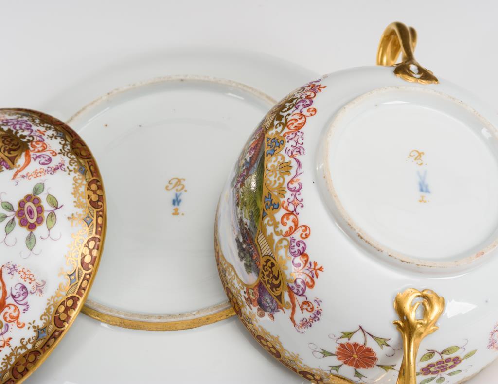 Terrine mit gewundenen Asthenkeln und Astgriffdeckel, mehrpassiges Presentoir. Auf Terrine, Deckel und Presentoir jeweils zwei von Laub- und Bandelwerk umgebene Vierpasskartuschen mit einer Fischerszene sowie der Darstellung von Vergnügungen der höfischen Gesellschaft (z.B. Entenjagd, Blinde-Kuh-Spiel, Hirschjagd). Auf den die Kartuschen flankierenden Konsolen kleine Chinesenfiguren. Partiell minimaler Goldabrieb.