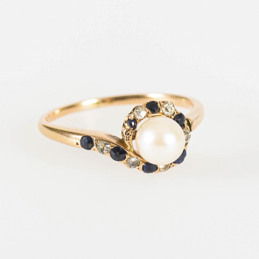 Ring mit Zuchtperle, Saphiren und Diamanten.