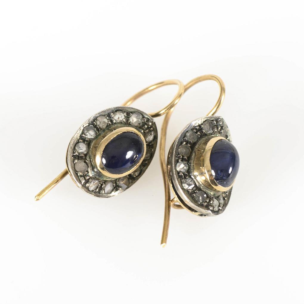 Ohrhängerpaar mit Saphiren und Diamantrosen.