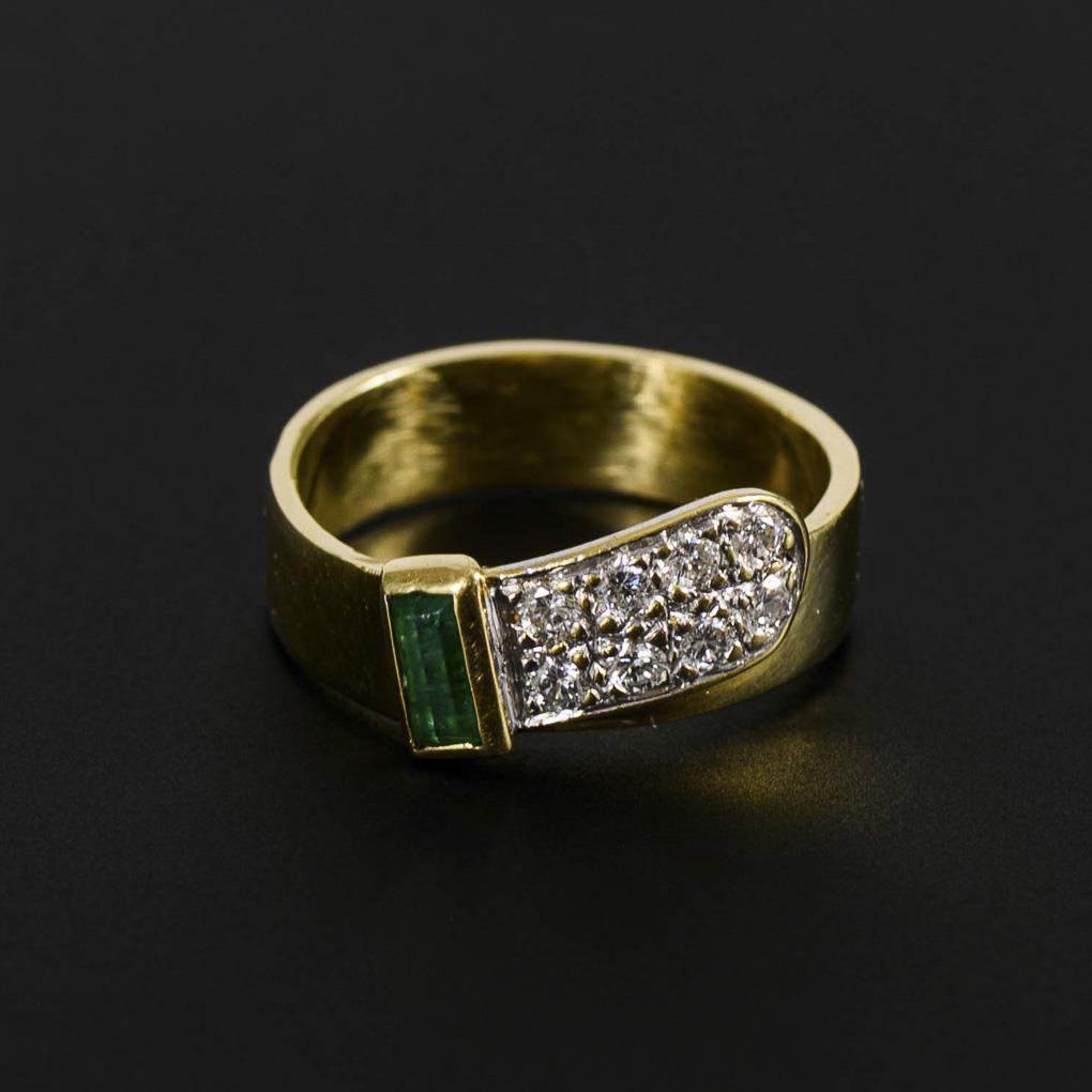 Zargengefasster Smaragd und 8 pavégefasste Brillanten auf breiter Schiene.