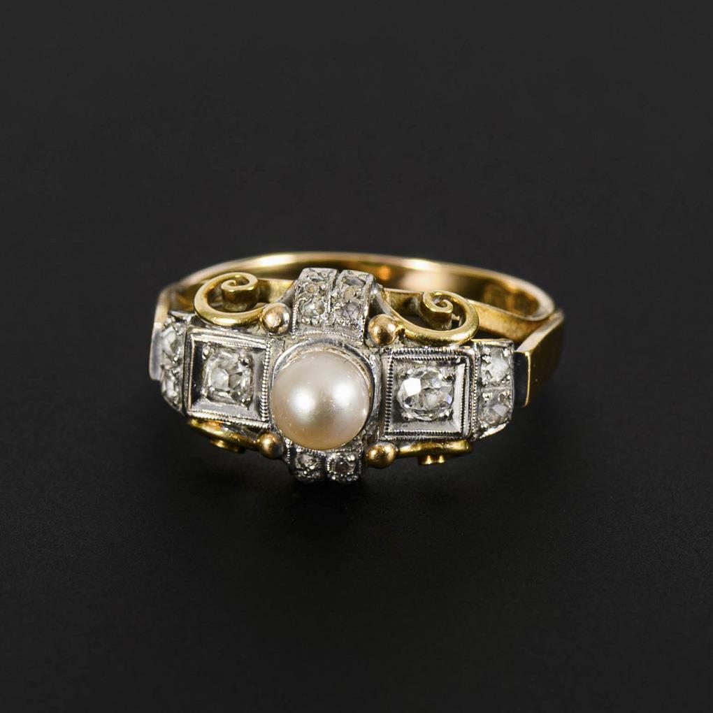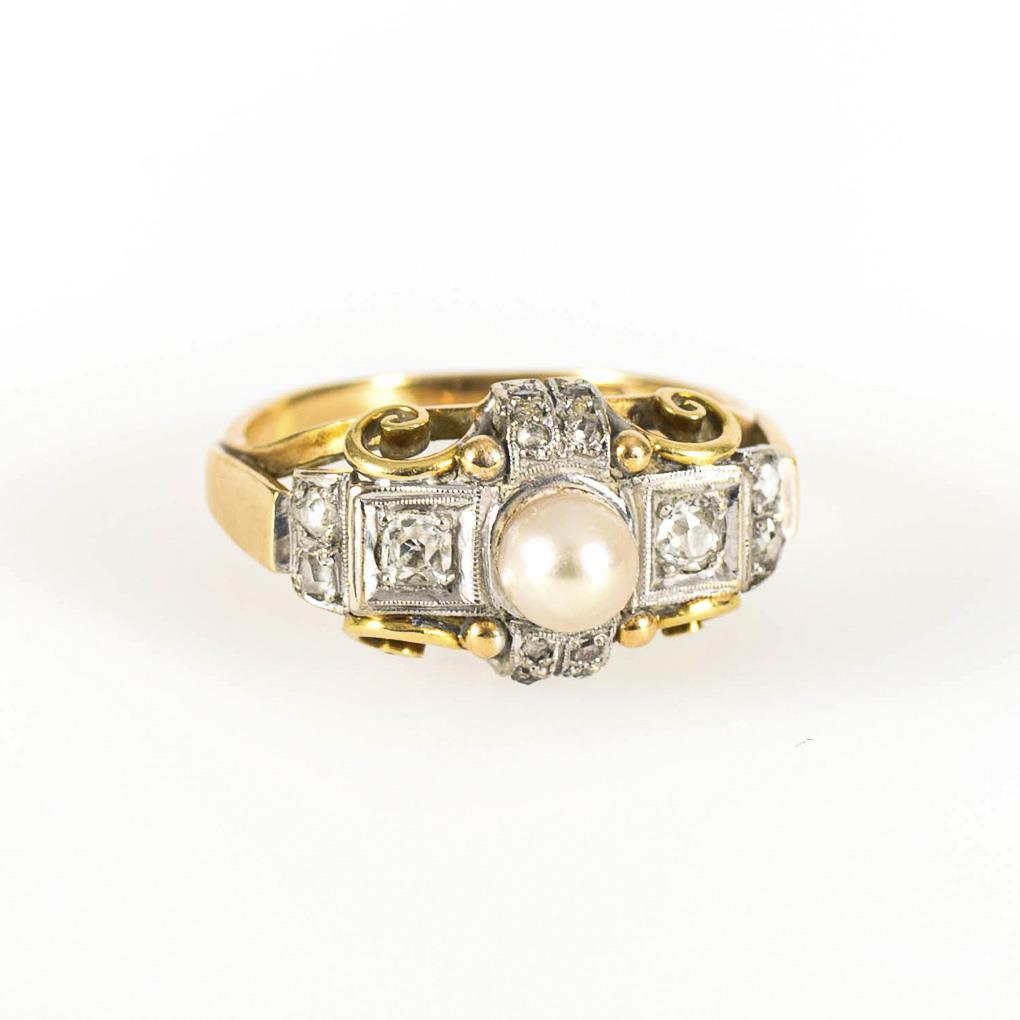 Art-déco-Ring mit Zuchtperle und Altschliff-Diamanten.