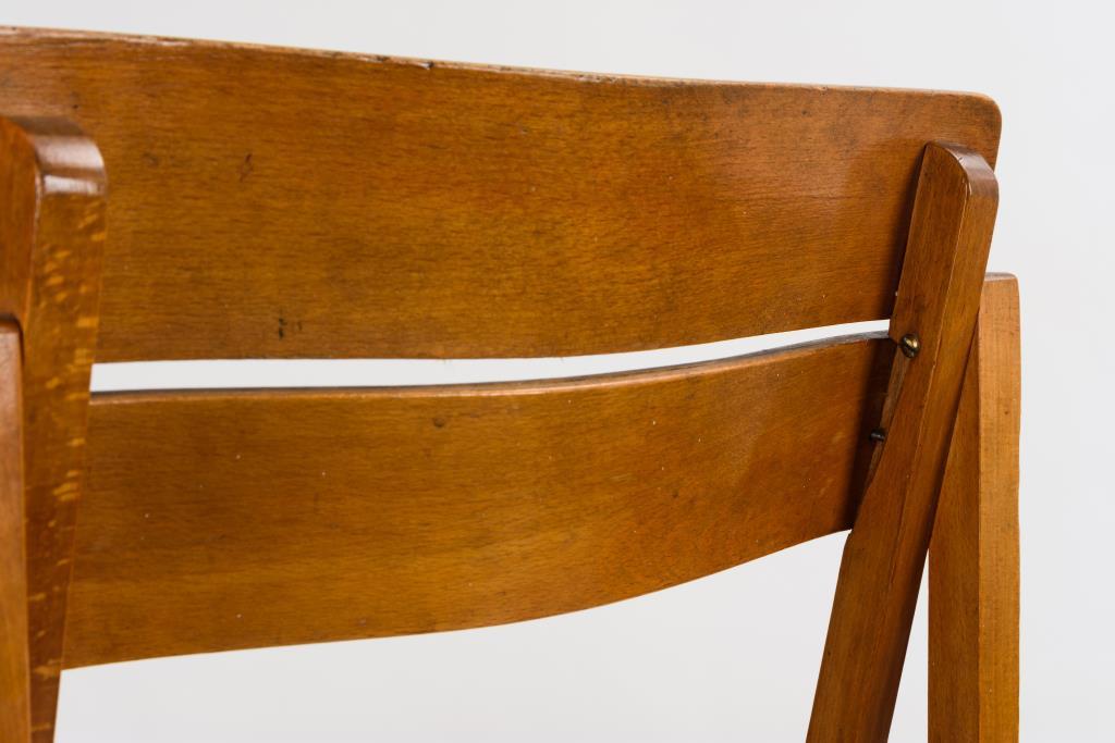 Streng funktioneller Stuhl mit Schultergurt und abgeschrägter Sitzfläche, in Anlehnung an Modelle Marcel Breuers (1902 Pecs - 1981 New York City). Alters-/Gebrauchsspuren.