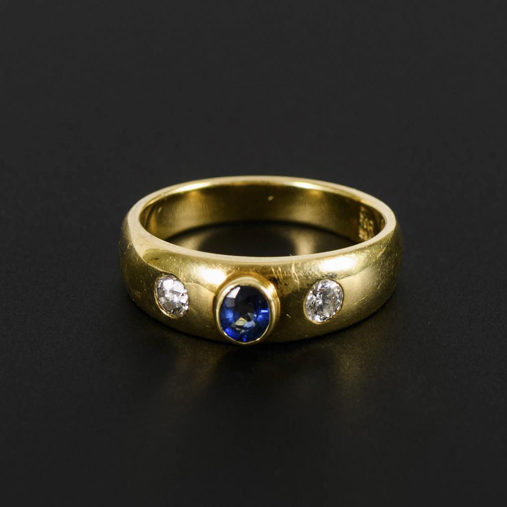 Mittlerer Reif mit zargengefasstem Saphir und 2 Brillanten.
