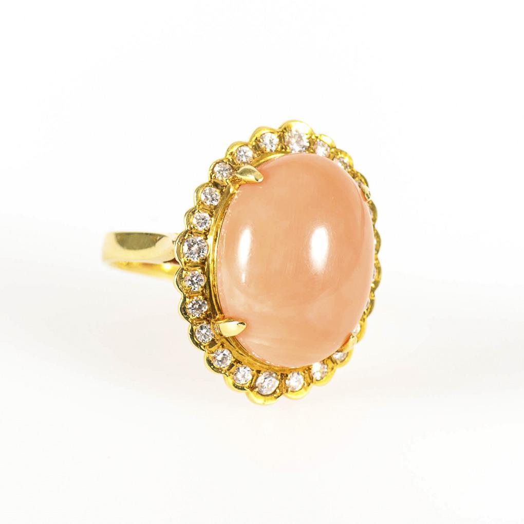 Krappengefasster Korallencabochon, umringt von 24 kleinen Brillanten. Mittlere Schiene.