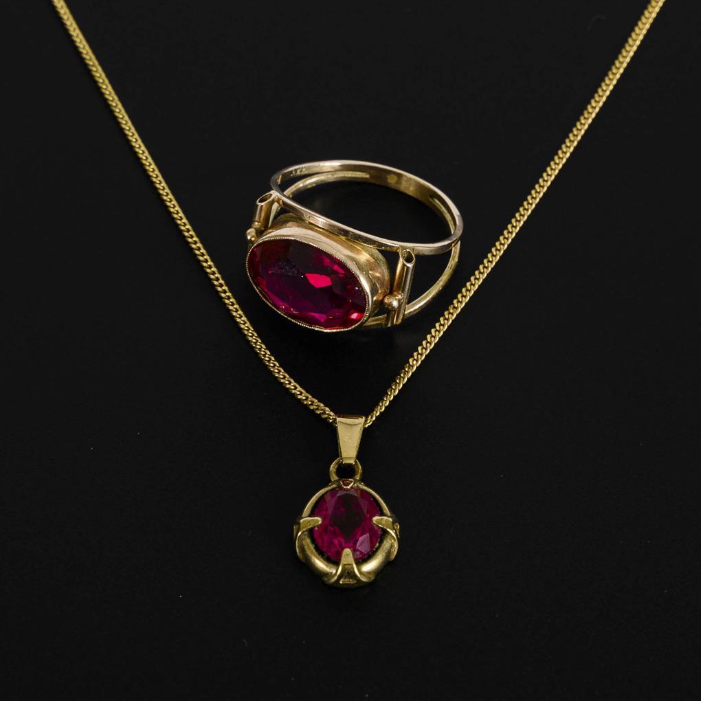 Gelbgold 333 gestempelt. Anhänger 1,2 x 1 cm. Kette L 50 cm. Ringgröße 60. 3,7/4,5 g.