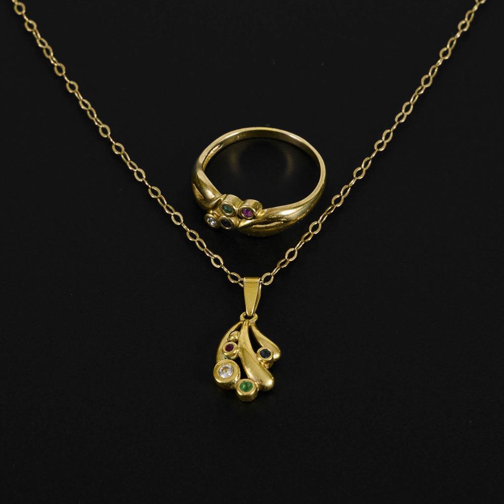 Anhänger und Ring mit kleinen, eingelassenen Rubinen, Smaragden, Saphiren und Zirkonias. Ankerkette mit Ringfederschließe. Schmale Schiene.