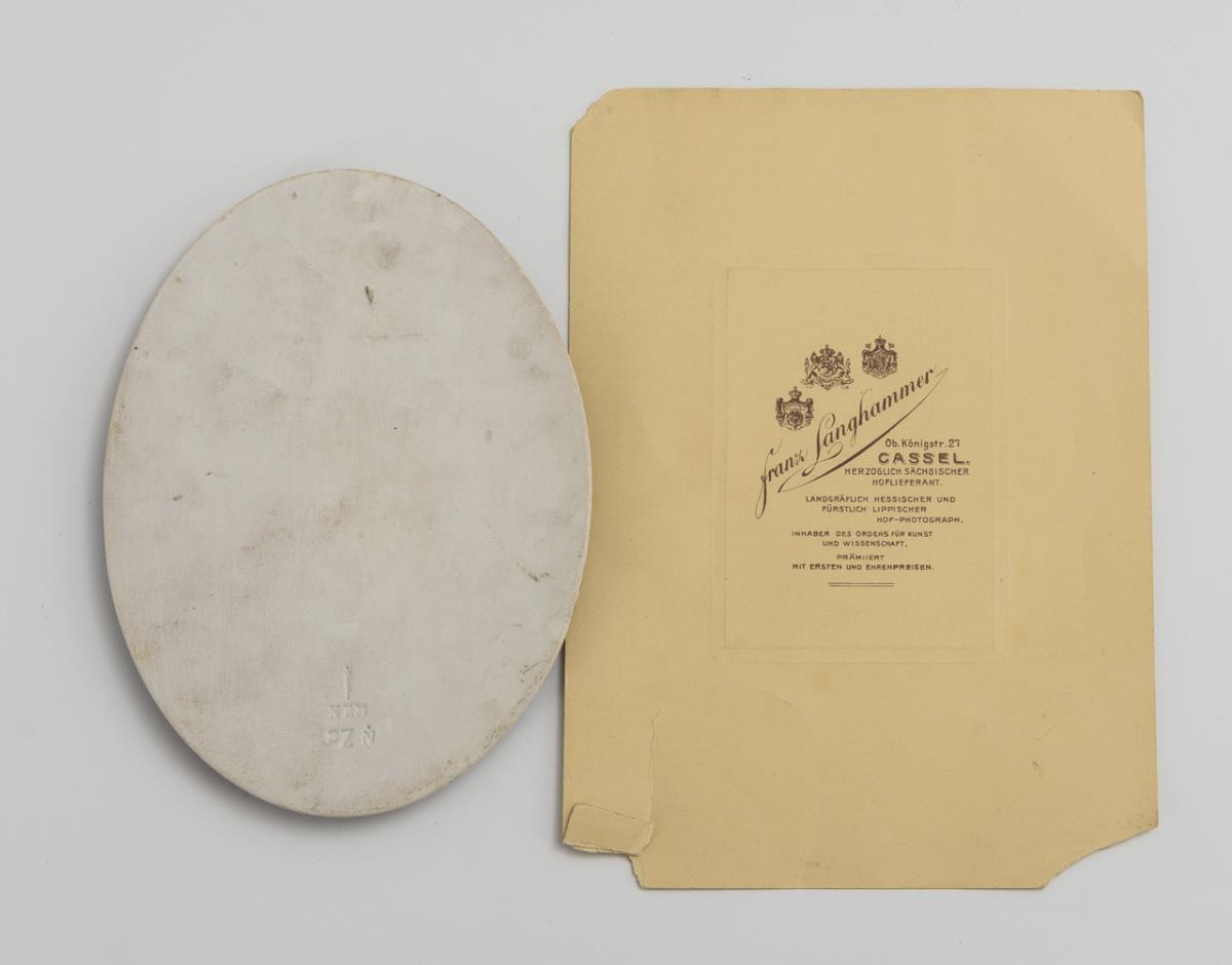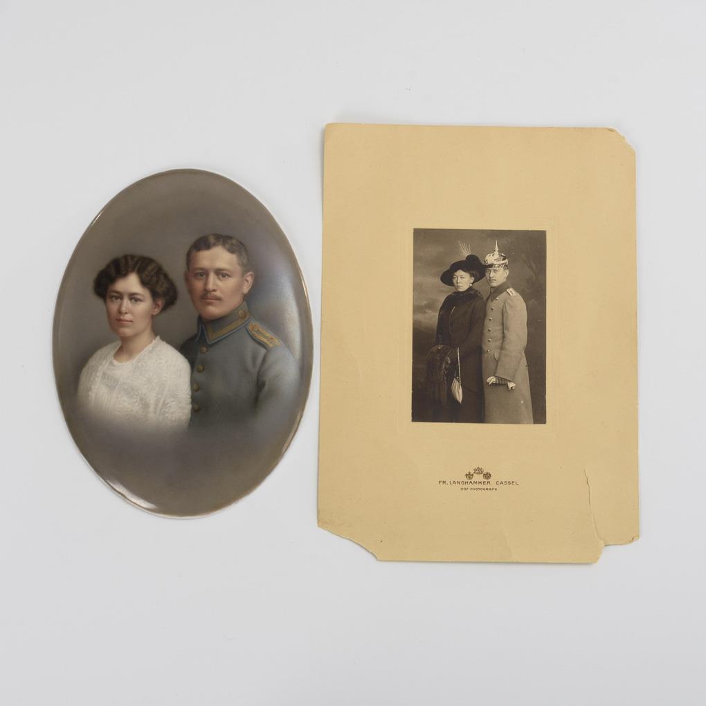 Ovale Bildplatte mit dem Bildnis eines jungen Mannes in Uniform und seiner Gattin im weißen Kleid. Dazu eine Fotografie des jungen Paares.
