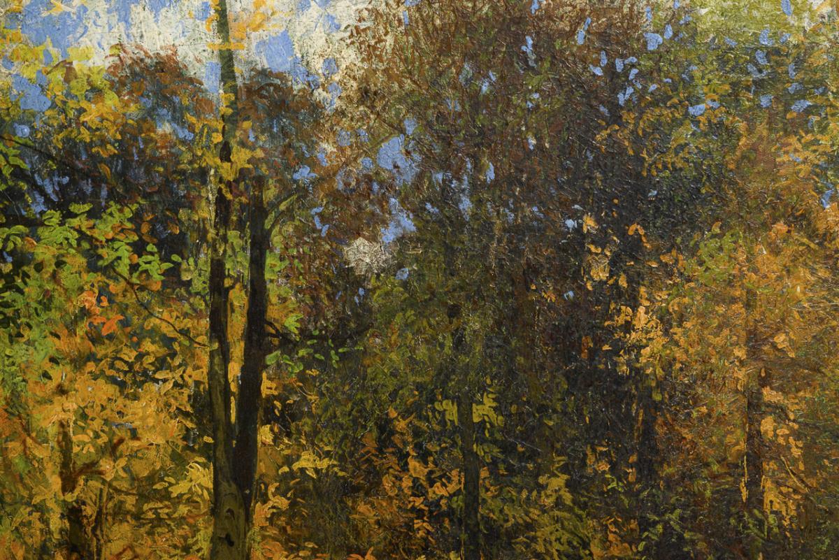 Heller Sonnenschein über den herbstlich verfärbten Bäumen an der Lichtung mit dem Weiher.