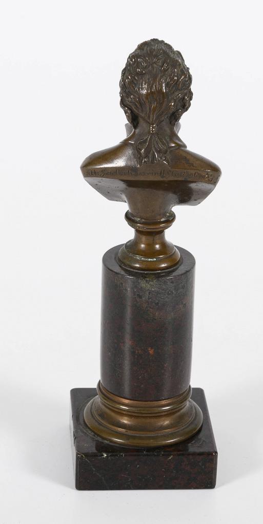 Bronze braun patiniert, schwarz-roter Marmorsockel mit Säulenbasis aus Bronze. Gießermarke "Akt: Gesellsch: vorm: H. Gladenbeck & Sohn". H 8,5 / 17 cm.