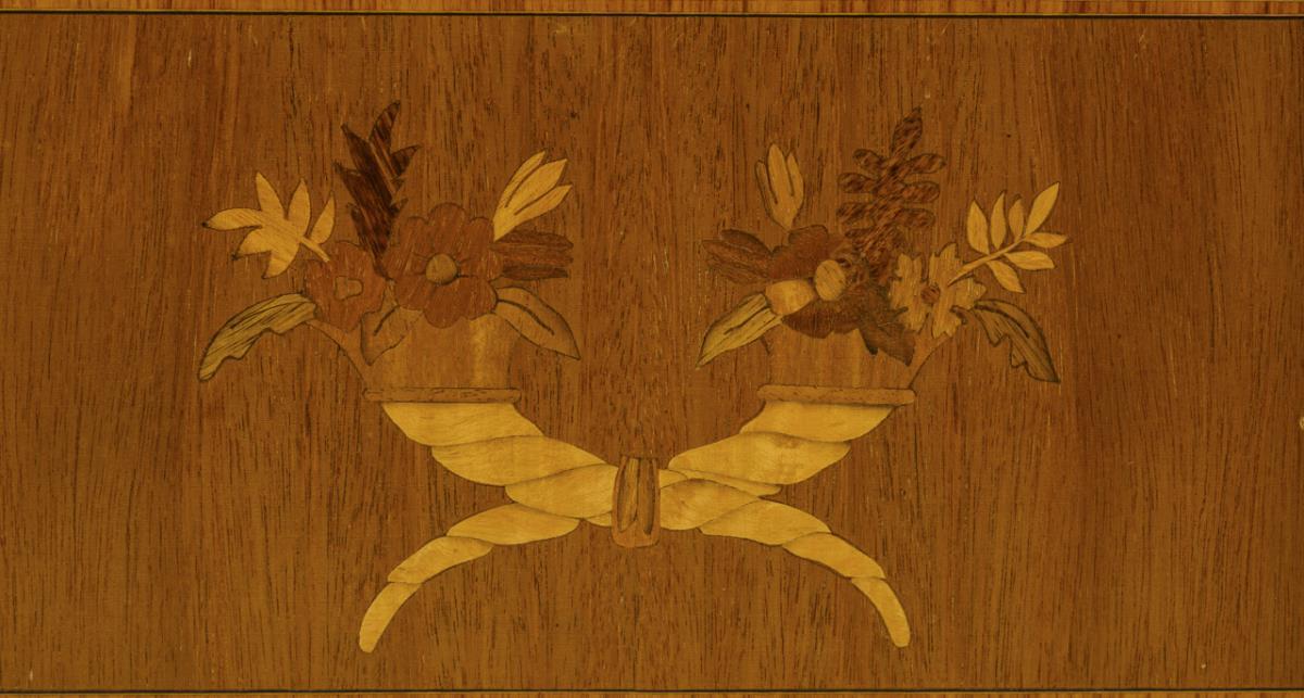 Verschiedene Hölzer furniert und marketiert, grünlich-grauer Marmor. Ca. 75 x 80 x 44 cm.