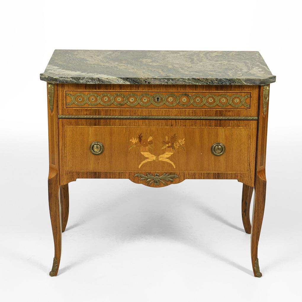 2-schübige, im Transition-Stil gestaltete Kommode auf 4 leicht ausgestellten Beinen, mit lose aufliegender, grünlich-grauer Marmorplatte; verziert mit Füllhornmarketerie und Messingbeschlägen. Leichte Alters-/Gebrauchsspuren.