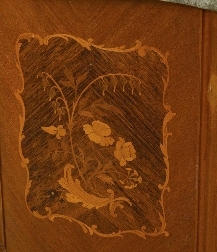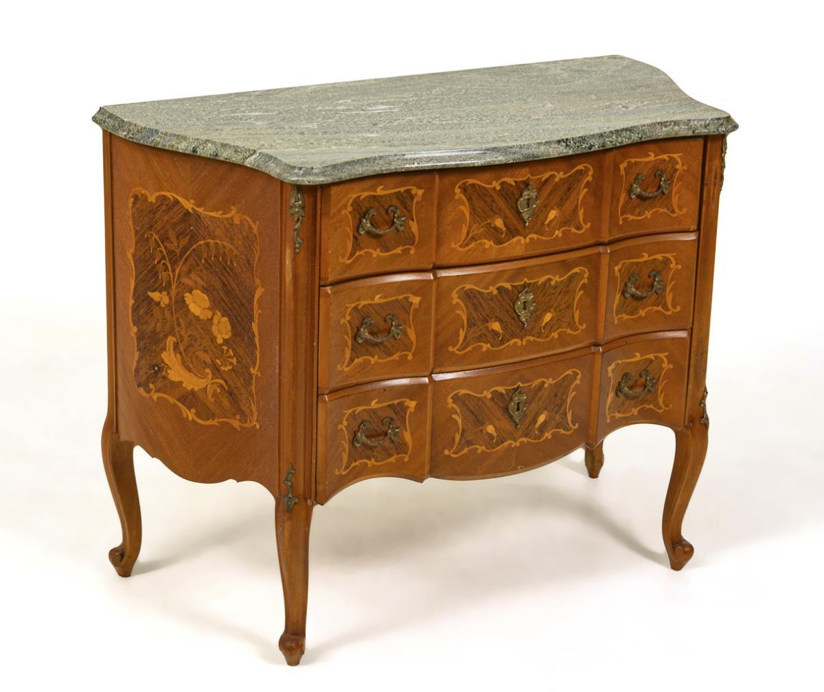 3-schübige, stiltypisch geschwungene Kommode mit Marmorplatte, dekoriert mit üppigen Bronze-Applikationen und rocaillengerahmter Blumenmarketerie an den Front- und Seitenteilen. Leichte Alters-/Gebrauchsspuren.
