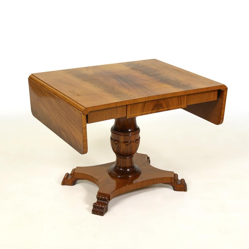 Seitenwangentisch auf reliefierter Baluster-Mittelstütze mit konkav eingezogener Fußplatte und 4 stilisierten Tatzenfüßen, Tischplatte verziert mit gespiegeltem Maserfurnier, Zarge mit kleinem Schub. Leichte Alters-/Gebrauchsspuren, Furnier mit kleinen Defekten.