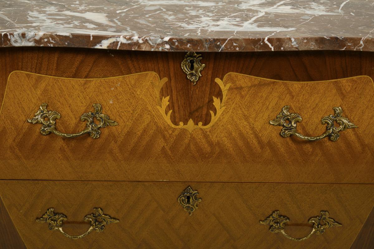 2-schübige, stiltypisch geschwungene Kommode mit Marmorplatte, dekoriert mit üppigen Bronze-Applikationen und parkettierten Front- und Seitenteilen. Leichte Alters-/Gebrauchsspuren.