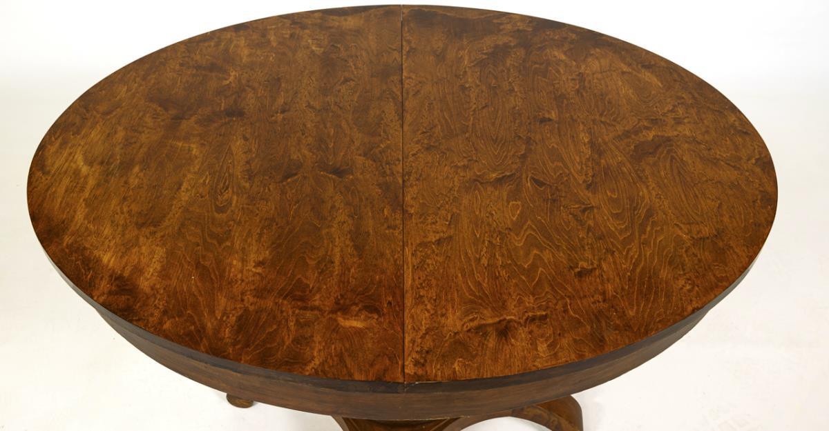 Nussbaum furniert und maserfurniert. Ca. 72 x 105 x 85 cm (ausgezogen max. 176 cm).