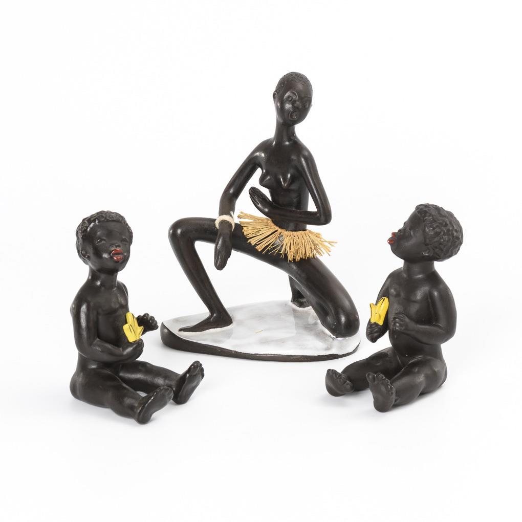 In Tanzhaltung kniende Afrikanerin mit Bastrock, auf flachem Sockel, Entwurf: Leopold Anzengruber (1912 - 1979), H 18,5 cm. Paar kleine Figuren sitzender, afrikanischer Kinder mit Bananen, H 12,5 cm.