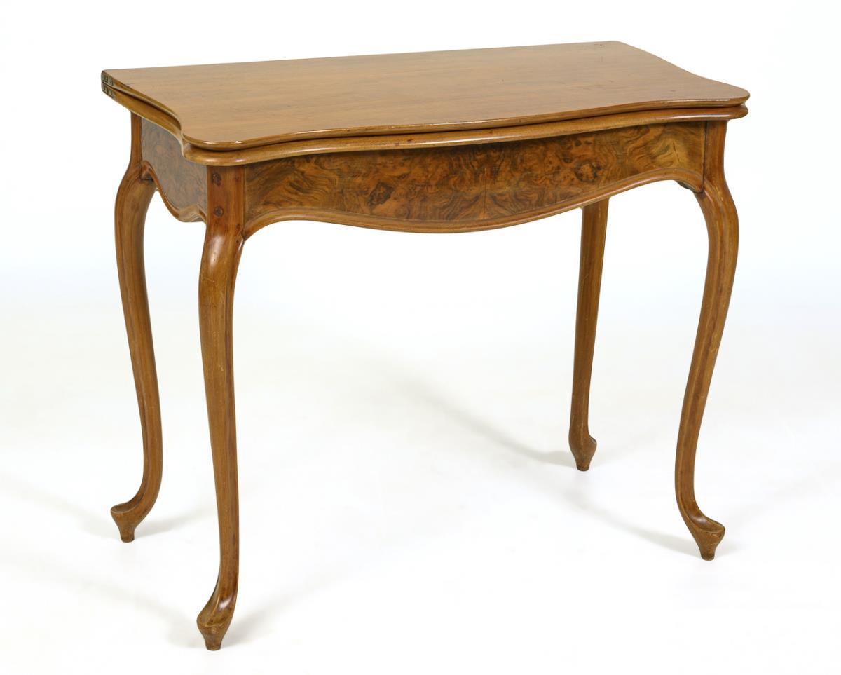 Spiel- und Konsoltisch in stiltypisch geschwungener Form mit dreh- und aufklappbarer Deckplatte auf Zargenkasten. Restauriert, Alters-/Gebrauchsspuren.