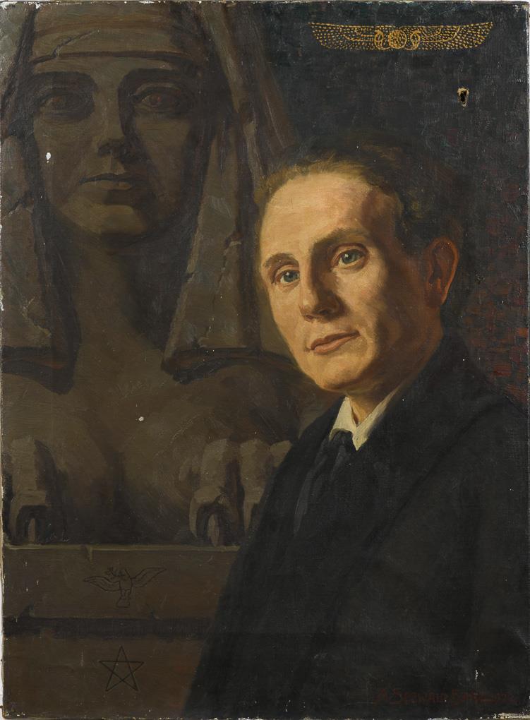 Porträt eines Mannes vor einer Sphinx. Ein Defekt.