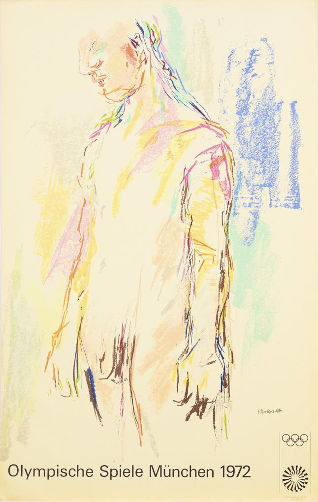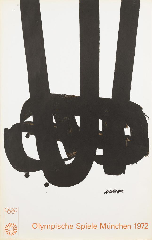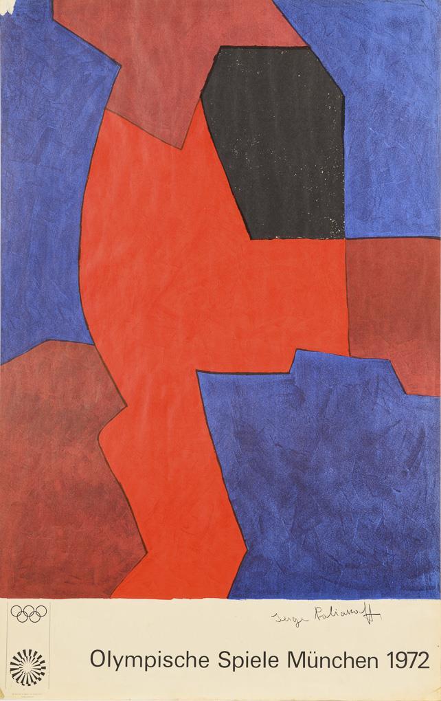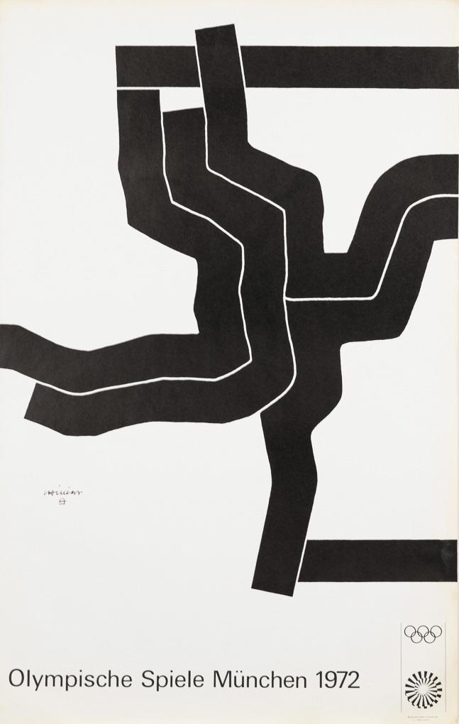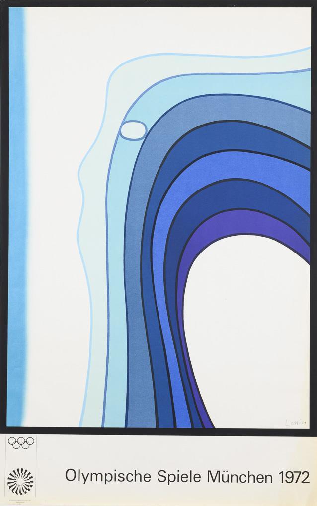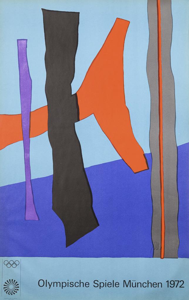 12 von 28 Plakaten aus der Kunstplakatserie "Edition Olympia" zu den Olympischen Spielen 1972 in seltener originaler Mappe - aus der 1. Teilserie, 1969: Serge Poliakoff, Marino Marini, Hans Hartung, Oskar Kokoschka, Fritz Winter, Jan Lenica und aus der 2. Teilserie, 1970: Horst Antes, Arakawa Shusaku, Eduardo Chillida, Allen Jones, Pierre Soulages, Victor Vasarely | blaue Mappe mit Aufdruck . Griff- und knickspurig, mit Wasserflecken, Reiß- und Klebespuren an den Ecken, Mappe mit Alters-/Gebrauchsspuren.