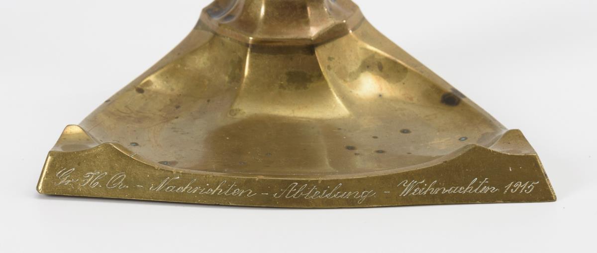 Taube mit aufgeplustertem Kropf an der Schale mit Widmung "Gr.H.Q. Nachrichten-Abteilung Weihnachten 1915". / Löschwiege mit stilisierter Taube. Teils einige Alters-/Gebrauchsspuren.