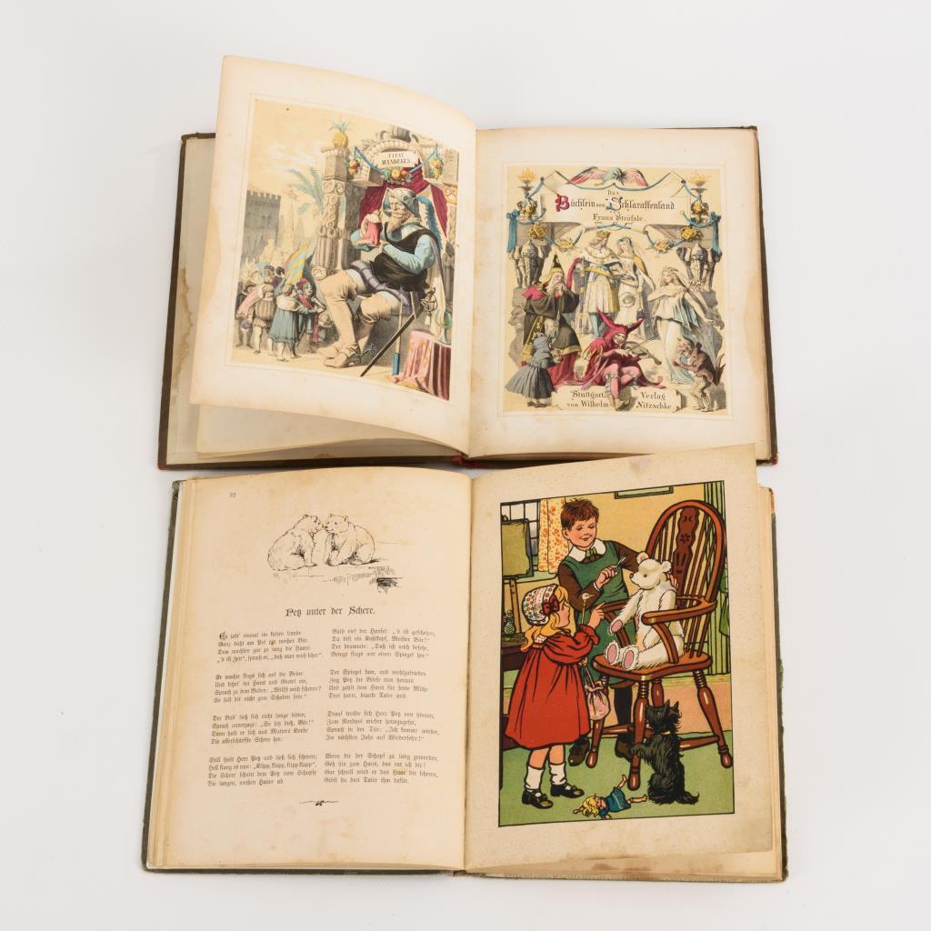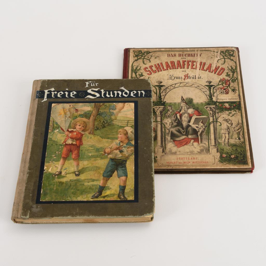 Marquardsen, Anna: "Für freie Stunden. Ein Gruss an die Kinderwelt in Wort und Bild. Erzählungen, Märchen und Gedichte für Kinder von 7-10 Jahren." Nürnberg, Theo Schroefer's Kunstverlag, (um 1910). 96 Seiten mit teils farbigen Abbildungen. / Straessle, Franz: "Das Büchlein vom Schlaraffenland Stuttgart (1866), Verlag Wilhelm Nitzschke. 48 Seiten mit 6 farbigen Abbildungen. Beide im Halbleineneinband. Altersgemäß guter Zustand.
