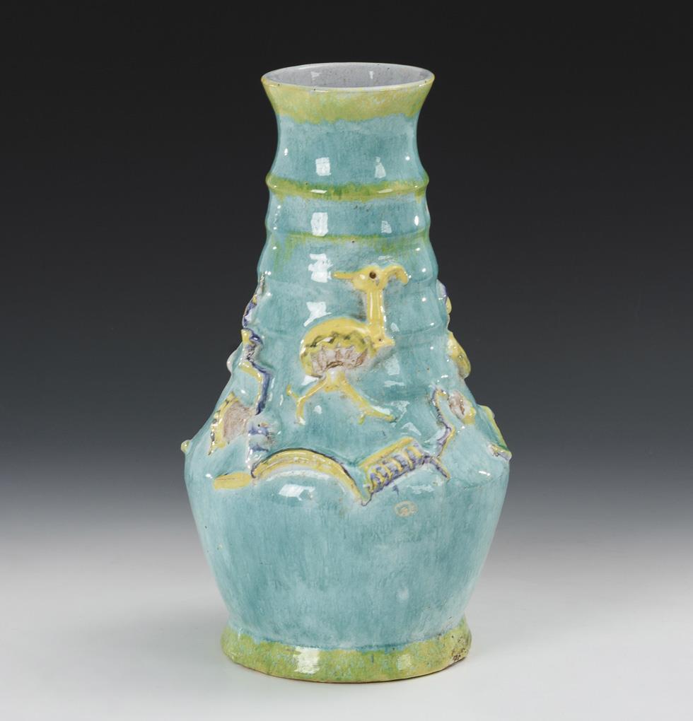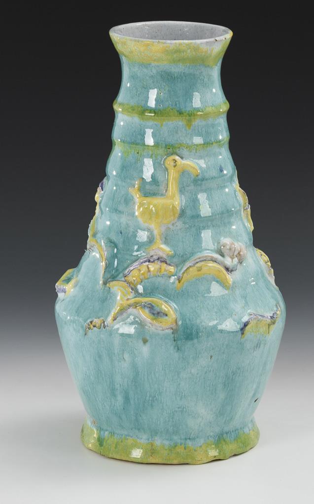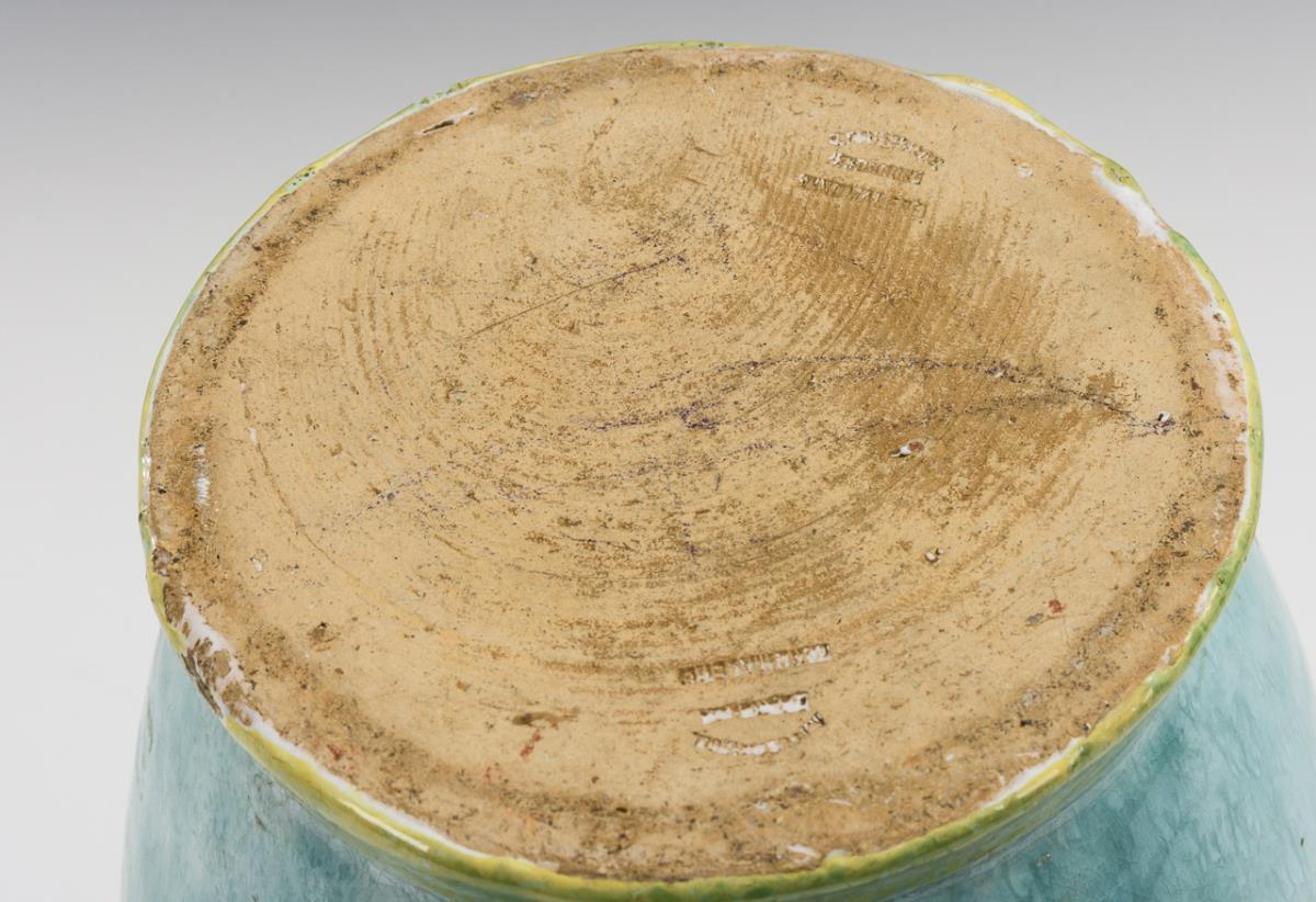 Heller, gedrehter Scherben, weiß glasiert, blaue Laufglasur, gelb und blau staffiert. H 33,5 cm.