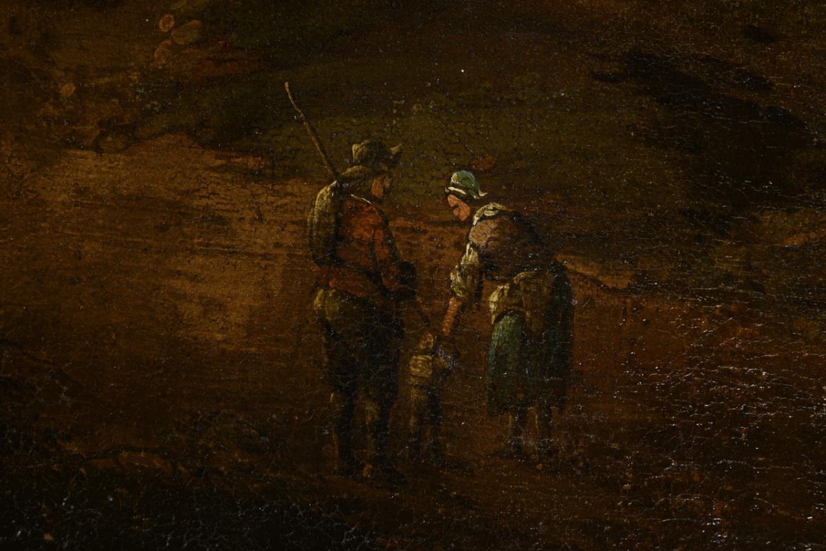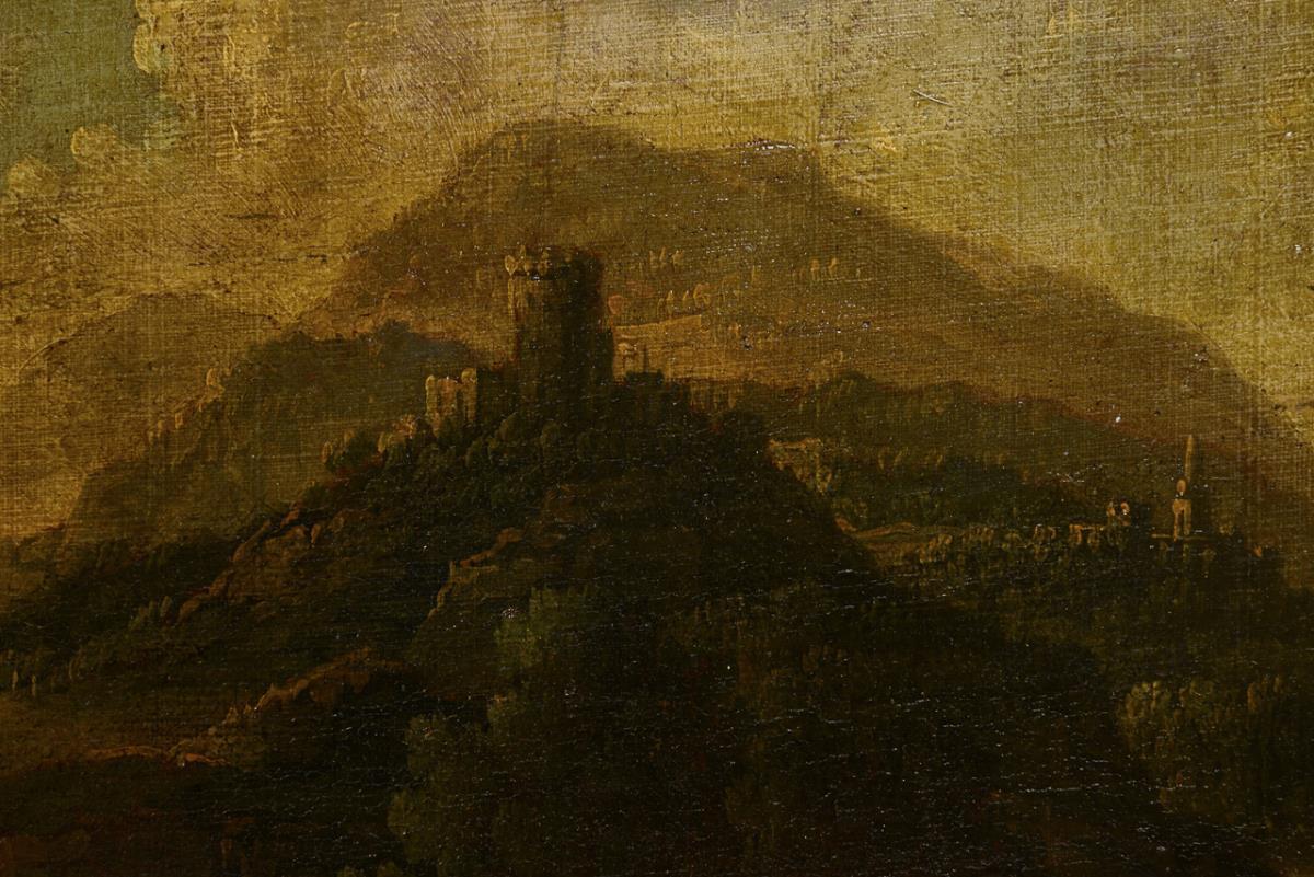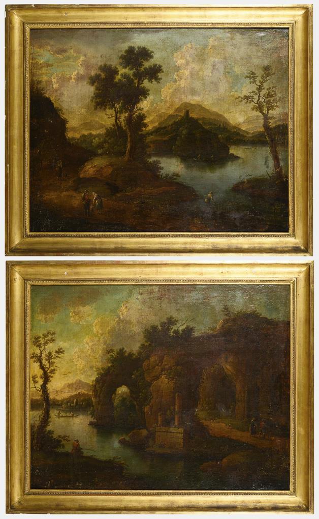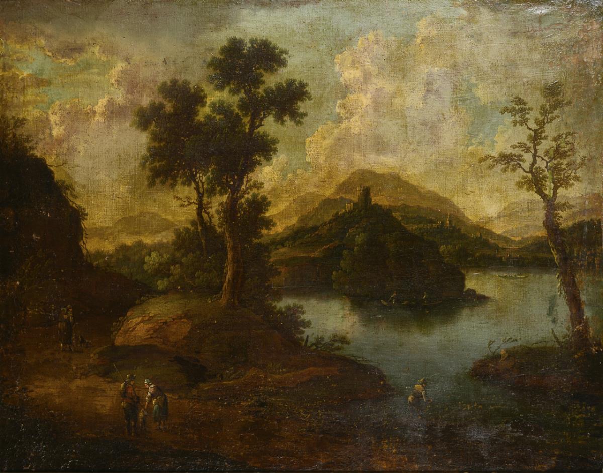 Staffagefiguren an einem Fluss nahe den Ruinen an einer Felsengrotte sowie Personen nahe dem Flussufer mit Blick zu den Burgen am anderen Ufer. Altersspuren, Farbabsplitterungen.