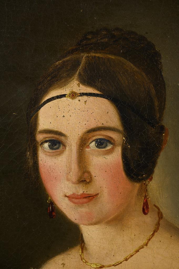 Porträt einer jungen Frau im blauen Kleid mit Goldschmuck. Ein Defekt.