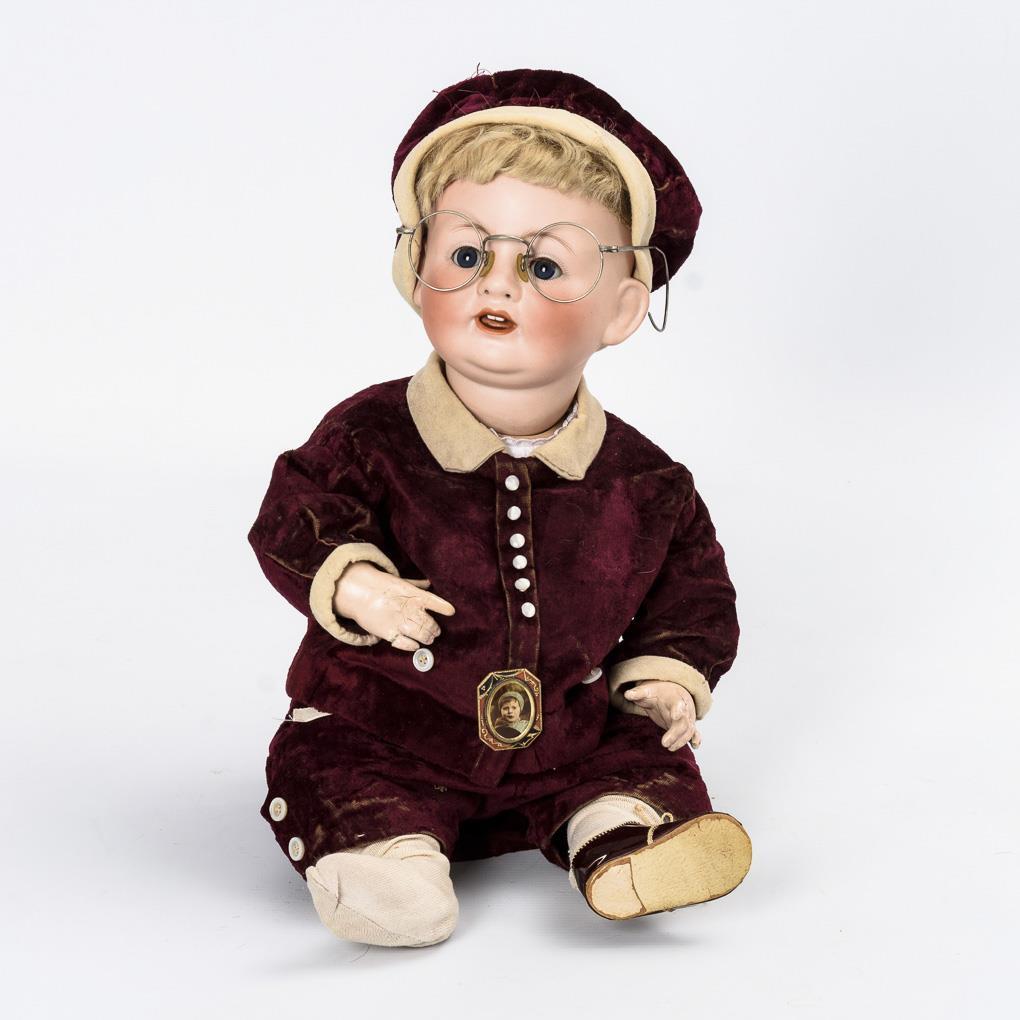 Kurbelkopf, blaue Schlafaugen, Wimpern, offene Nasenlöcher, blonde Mohairperücke. 5-teiliger Sitzbabykörper. Weinroter Anzug mit passender Mütze, Brille, 1 Schuh. Kopf durchleuchtet: ohne Defekte. Körper mit Farbrissen und Reparaturen, 2 Finger defekt.