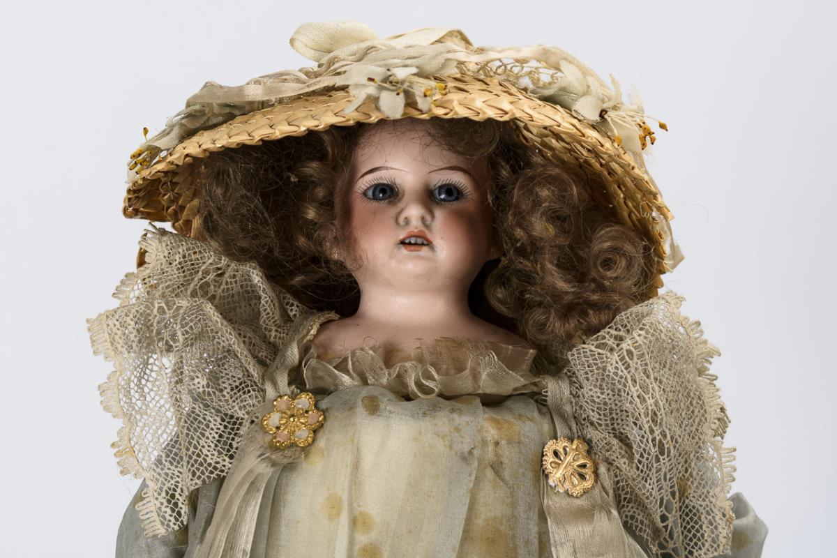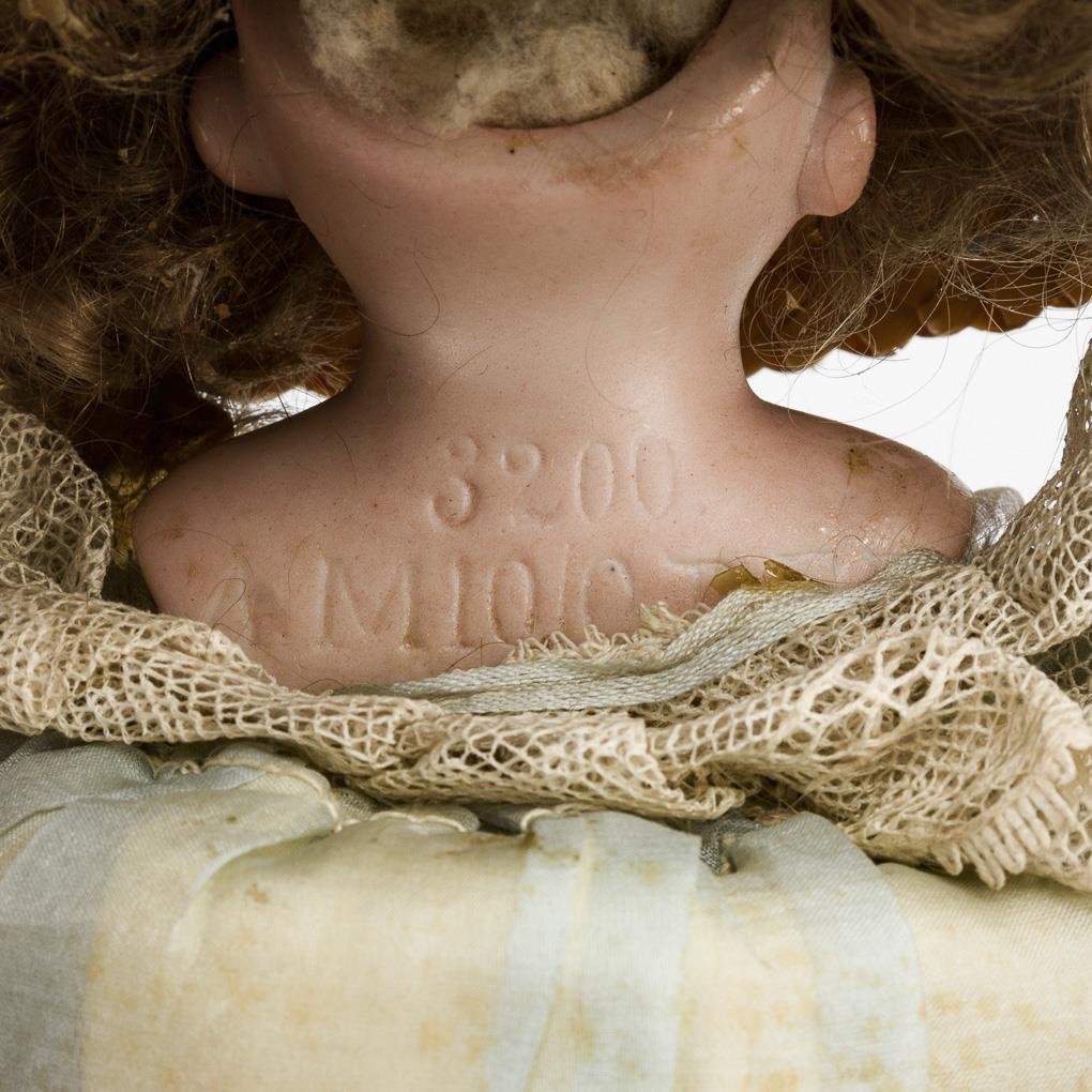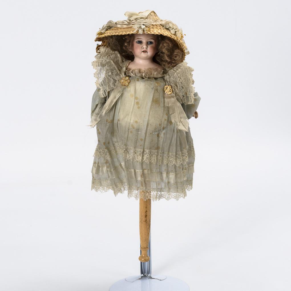 Brustkopf, feste blaue Glasaugen, blonde Mohairhaare. Drehbarer Pappkörper mit intaktem Werk an Drechselstab. Altes Kleid aus zartem blauem Stoff, Strohhut. Kopf ohne sichtbare Defekte, Kleid fleckig mit Altersspuren.