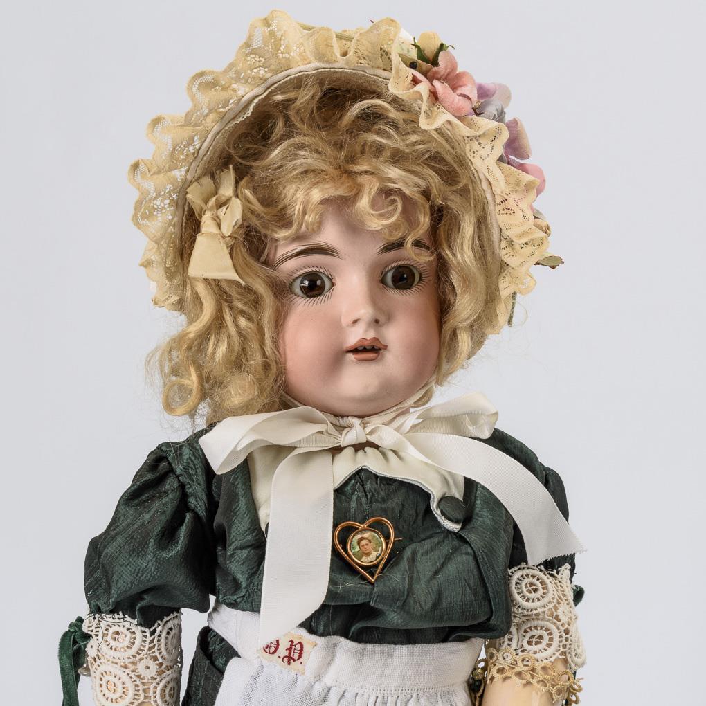 Jeweils mit Kurbelkopf, braunen Schlafaugen, blonder Mohairperücke, 15 teiligem Gliederkörper, dunkelgrünem Seidenkleid und Schutenhut. Köpfe nicht durchleuchtet: keine Defekte sichtbar.