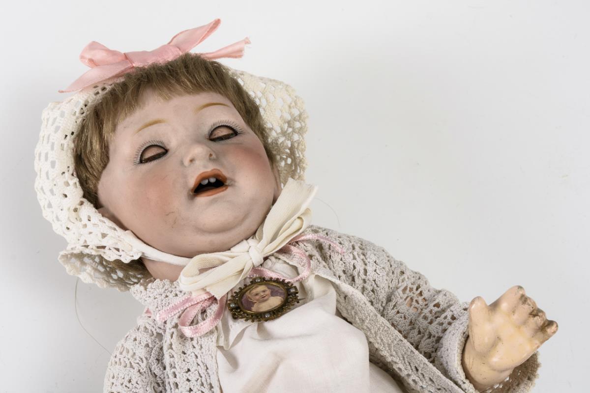 Kurbelkopf mit fest vergipstem Deckel, blaue Schlafaugen, alte blonde Mohairperücke. 5-teiliger Sitzbabykörper. Weiße Häkelkleidung, Mützchen, Brosche. Kopf ohne sichtbare Defekte, Arme ergänzt (1x mit Splint am Oberarm).