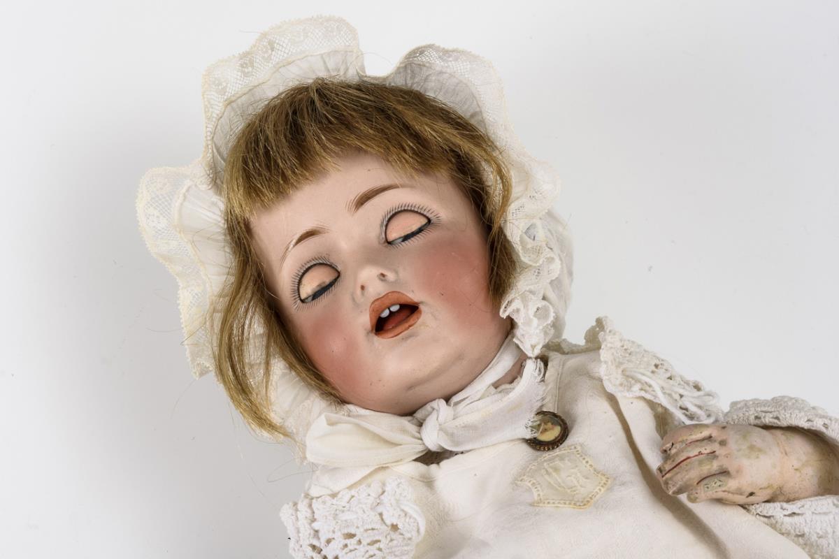 Kurbelkopf, blaue Schlafaugen, bewegliche Zunge, blonde Echthaarperücke. 5-teiliger Sitzbabykörper. Weiße Kleidung mit Häubchen, Brosche. Kopf durchleuchtet: ohne Defekte. Körper mit Übermalungen.