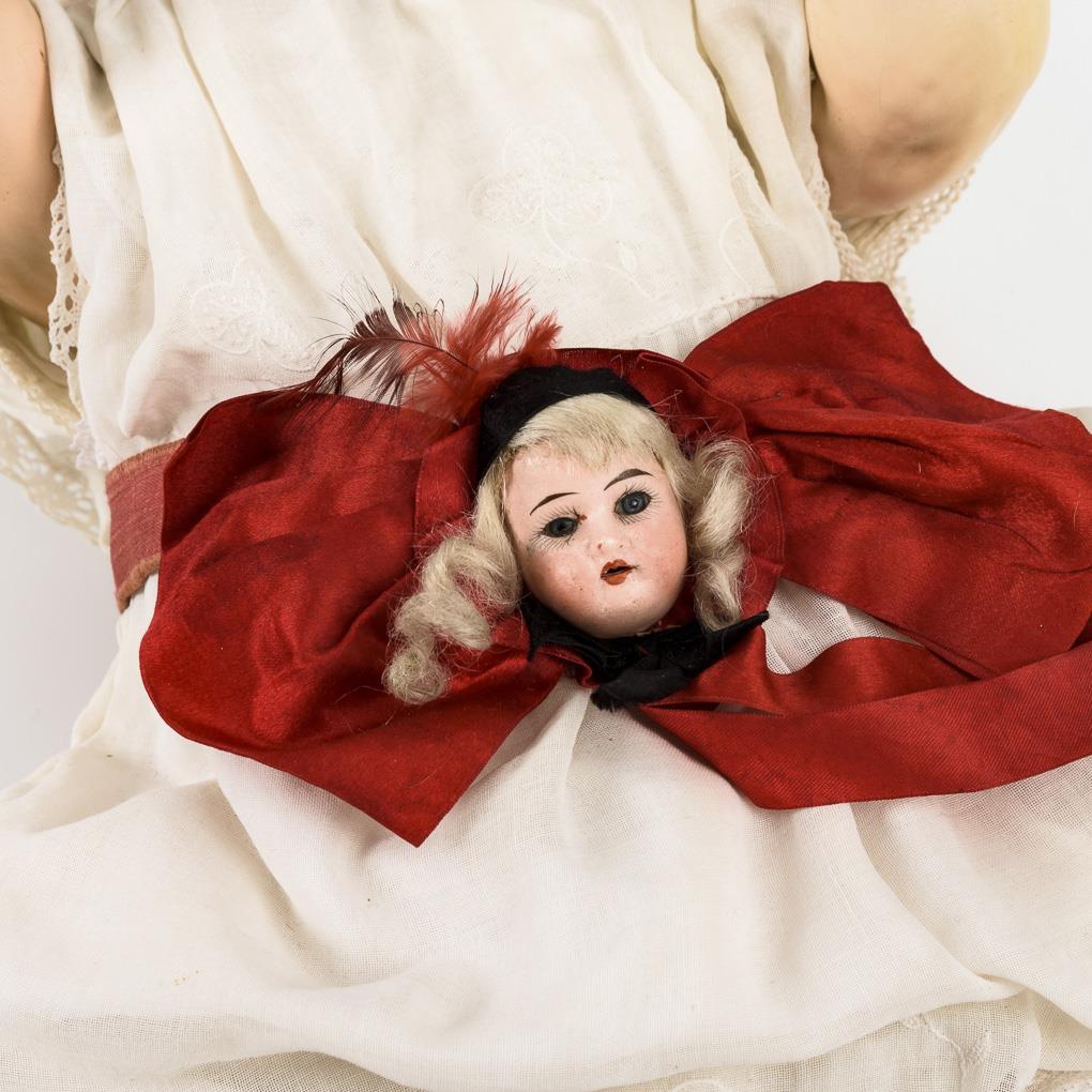 Kurbelkopf, braune Schlafaugen, bewegliche Zunge, blonde Echthaarperücke. 5-teiliger Sitzbabykörper. Weißes Kleid mit roter Taillenschleife und Puppenkopf, rote Schuhe, weißes Häubchen. Kopf durchleuchtet: ohne Defekte. Bespielt, Zunge und Hände berieben.