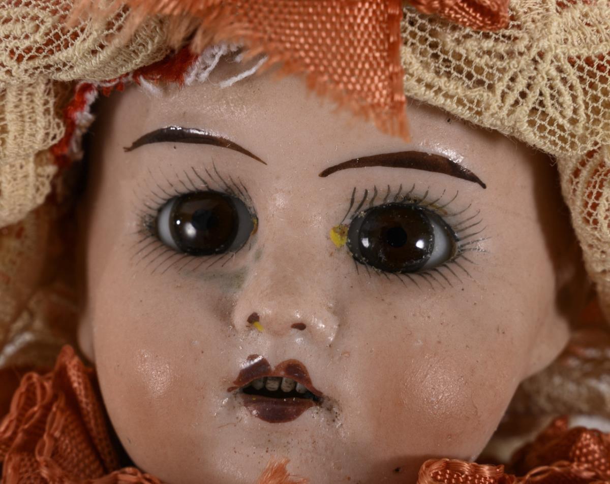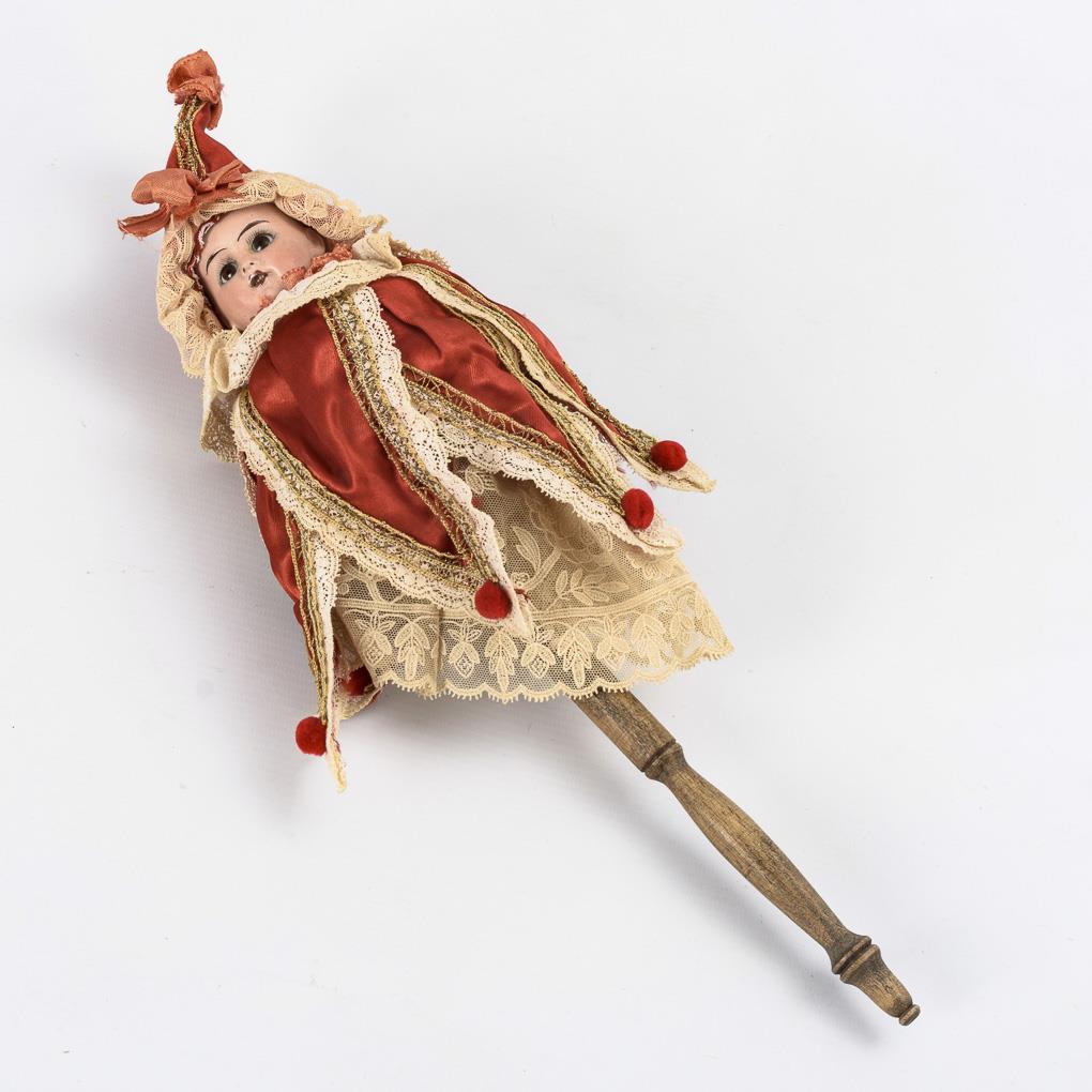 Brustkopf, feste braune Glasaugen, drehbarer Pappkörper mit intaktem Spielwerk an Drechselstab. Rot-weiße Kleidung im Harlekin-Stil. Kopf ohne sichtbare Defekte, Kleidung aus alten Stoffen ergänzt.