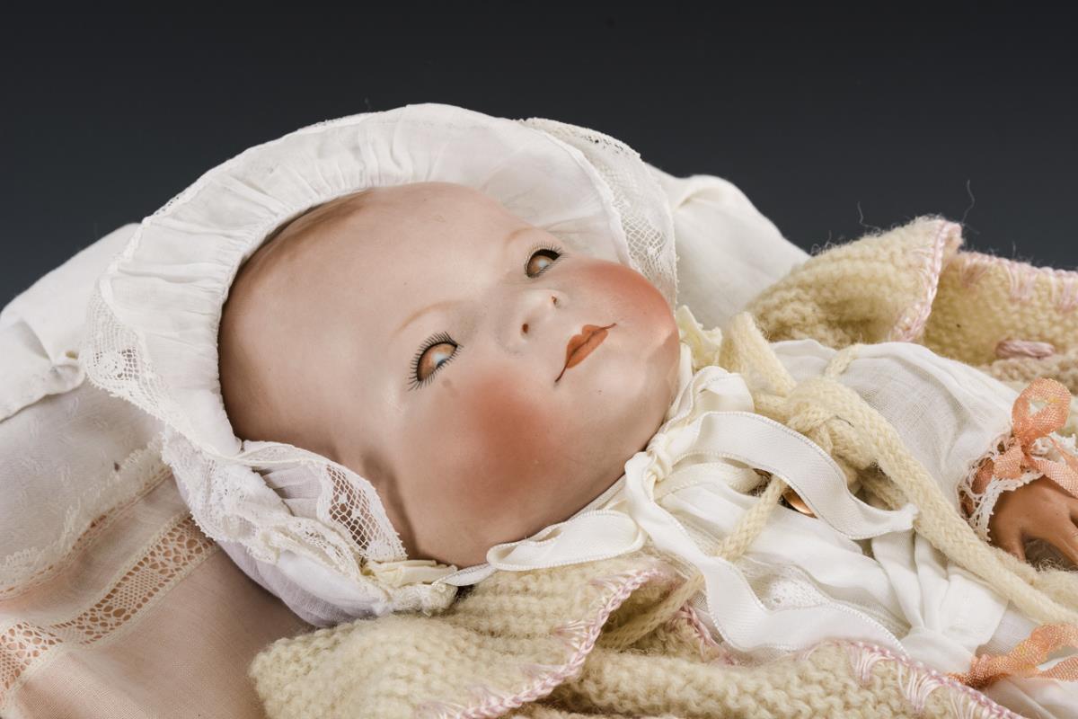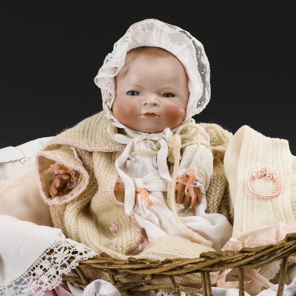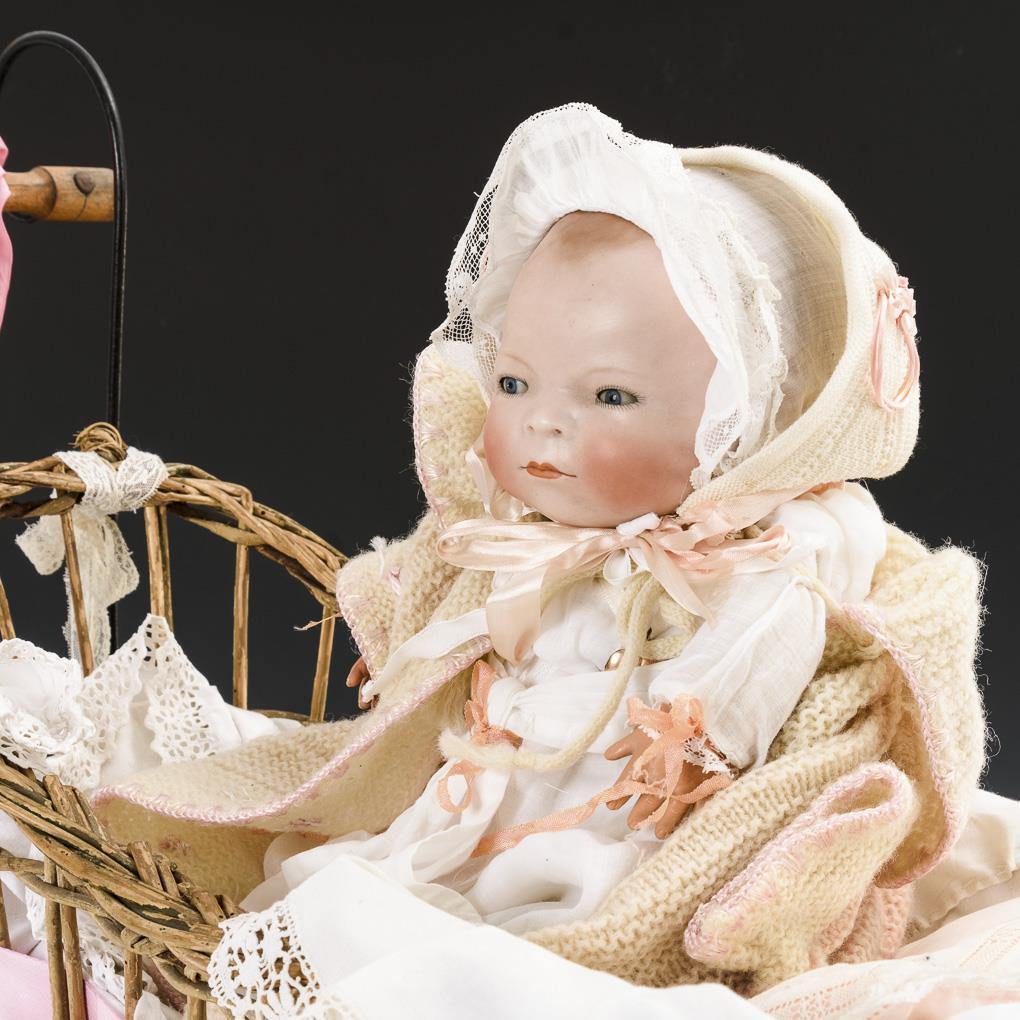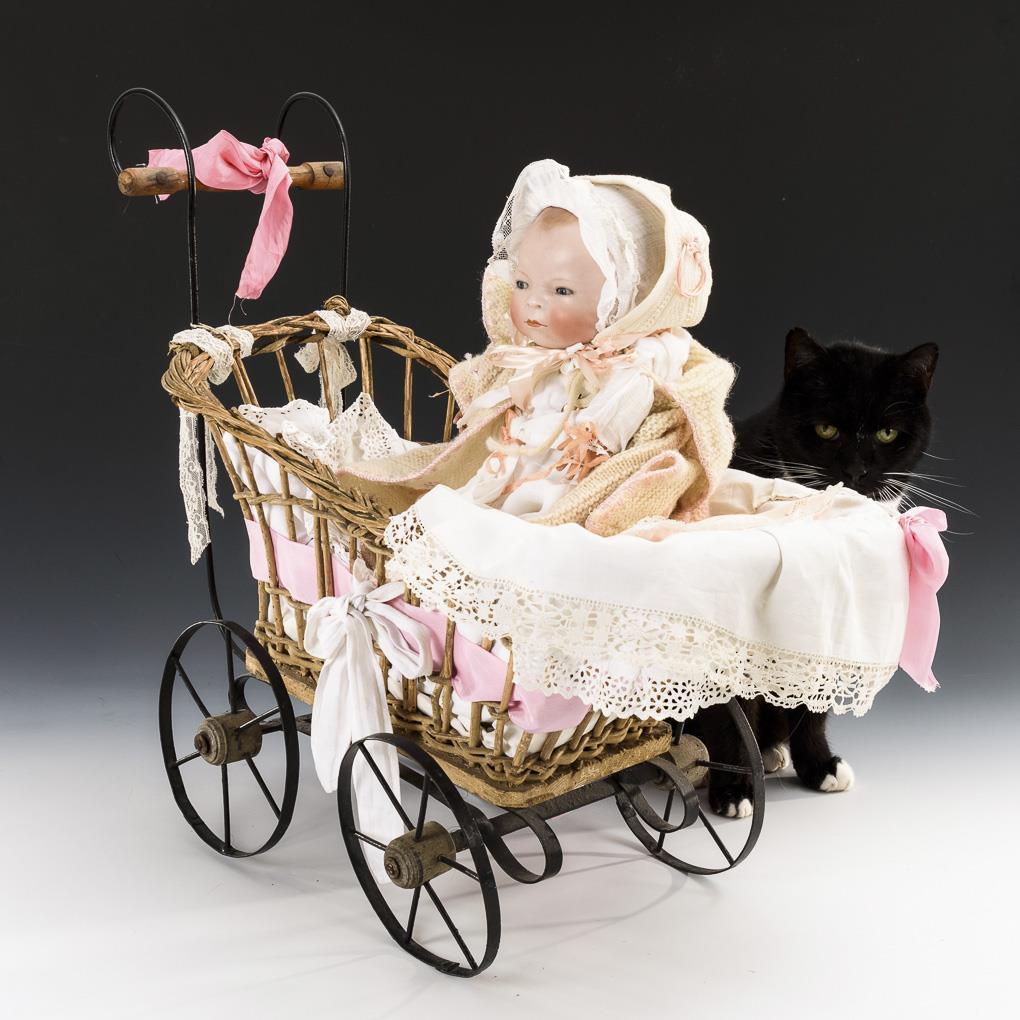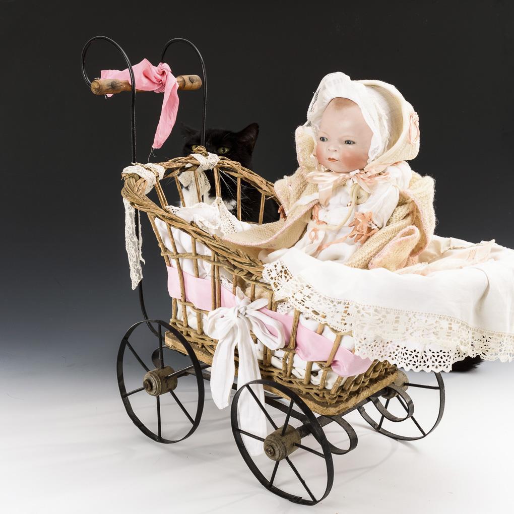 Einbindekopf, blaue Schlafaugen, braun getönter Haarboden. Sitzender Stoffkörper mit verblasstem Stempel, verstummter Stimme und Celluloidhänden. Helle Kleidung, Mützchen, Herzmedaillonanhänger. Augenlider minimal berieben. L 26 cm. Dazu kleiner geflochtener Wagen mit Eisenrädern. Mit Alters- und Reparaturspuren. 53 x 63 x 28 cm.